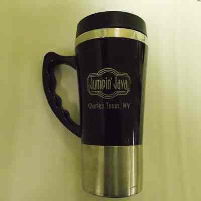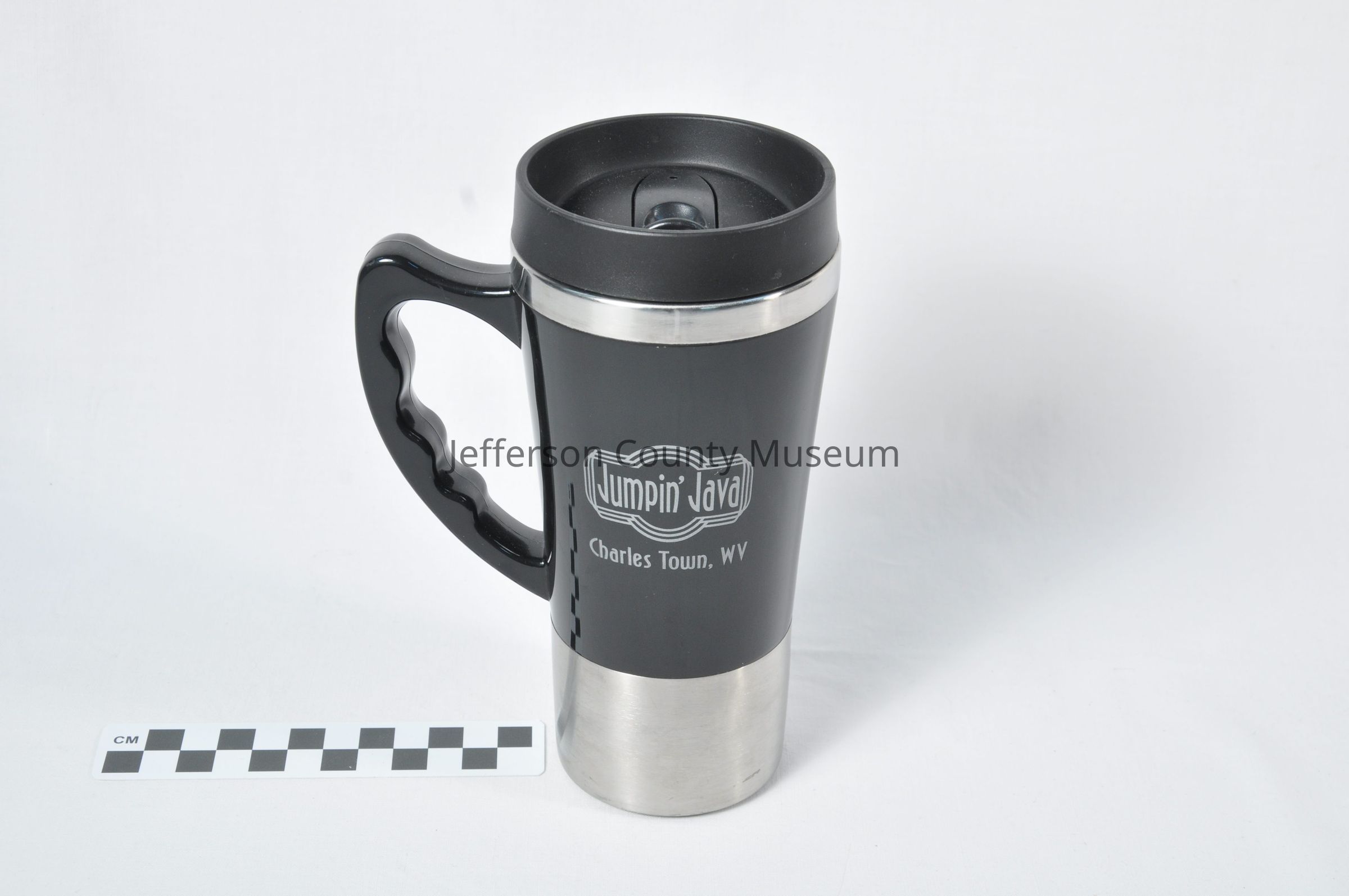 Early 21st century stainless steel travel coffee mug; black plastic center with grey text reading: "Jumpin' Java Charles Town, WV." Plastic lid and handle. Jumpin' Java was a coffee shop in Charles Town, West Virginia for several years in the early 21st century.Acquisition