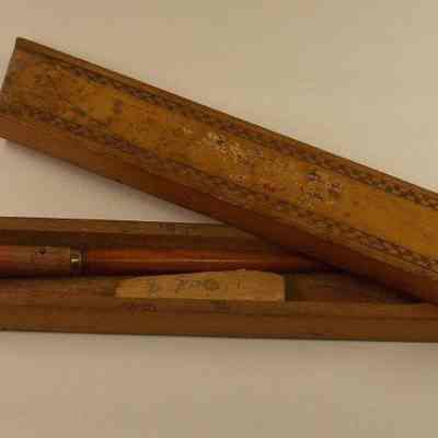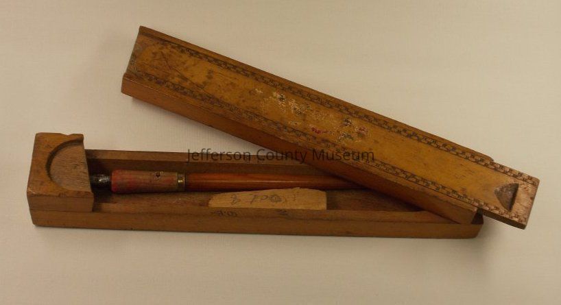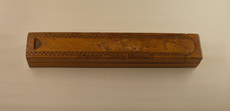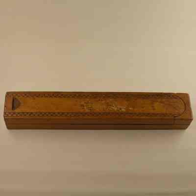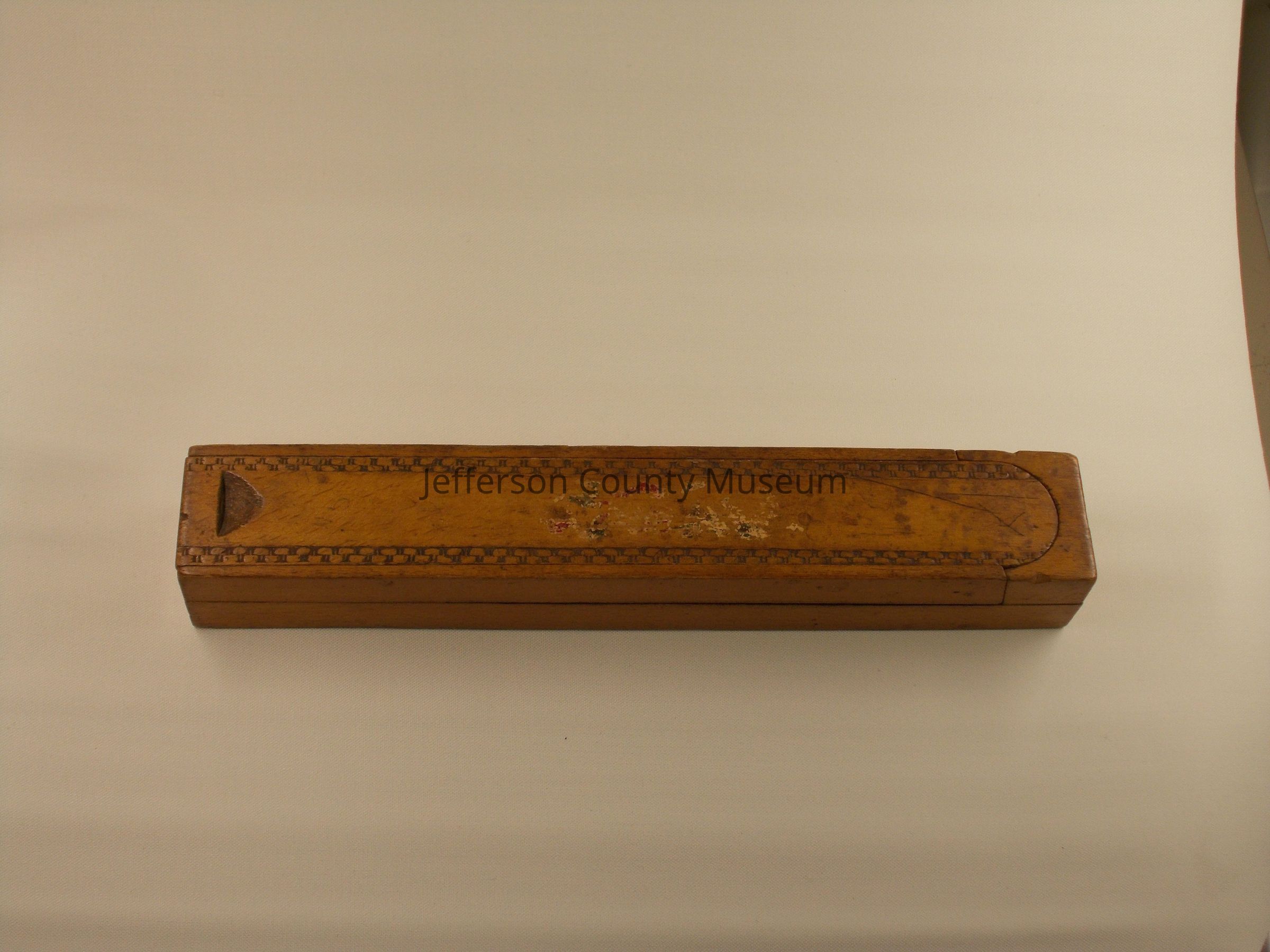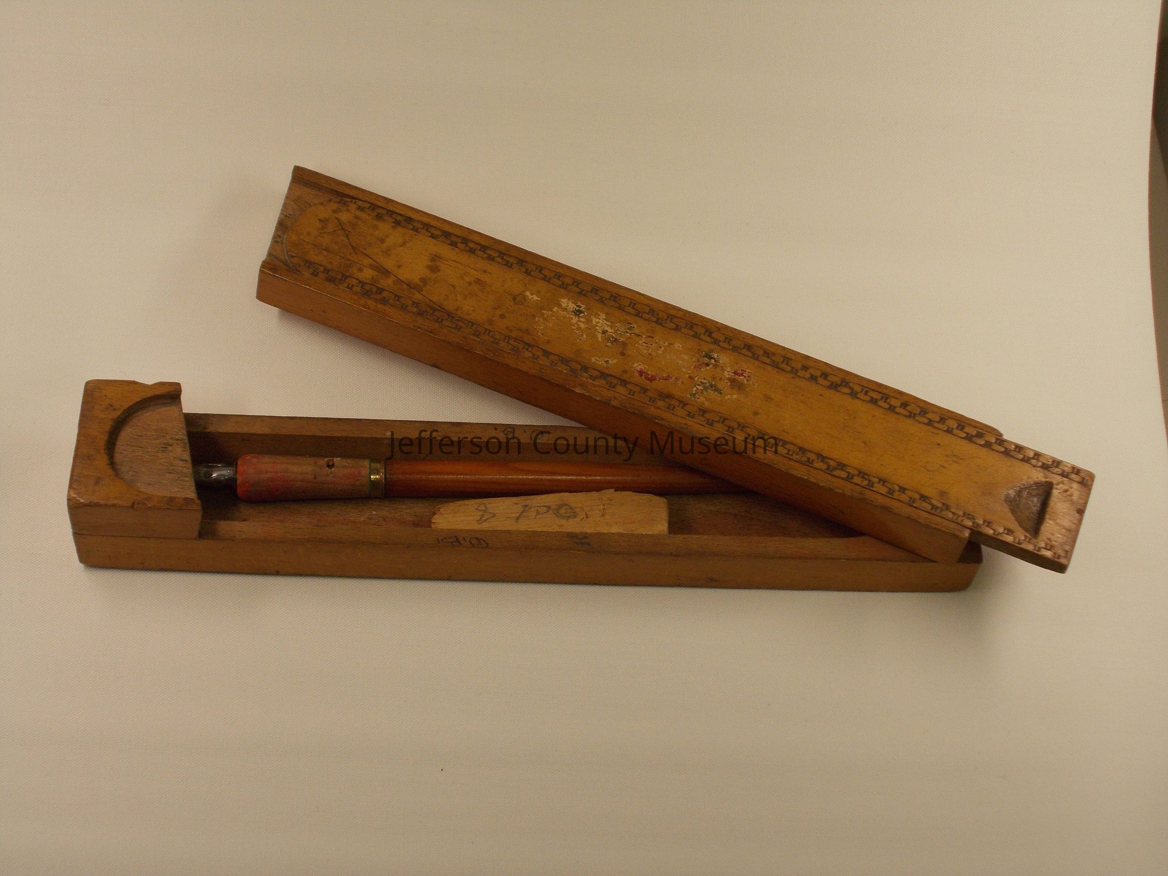 Wooden pen or pencil box or case containing a wooden calligraphy pen and a small wedge of wood. Case lid has a checkered ornamentation around its edges and a carved pull notch on its slide lock mechanism. The case has two compartments: The top of the lid slides straight out to reveal three grooves for pen or pencil storage; and, the whole lid swivels out from side to side to reveal the main compartment. Initials "O.B." written on top and bottom edge of main compartment. "Ollie Blessing" written on the side of one groove.