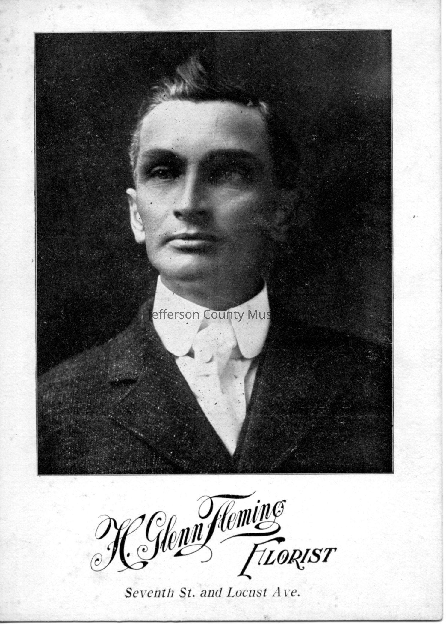 2 sepia-tone photographs of Glenn Fleming and 2 identical advertising cards of H. Glenn Fleming, Florist. Glenn Fleming was the son of Benjamin D. Fleming and Jennie Mayers Fleming.