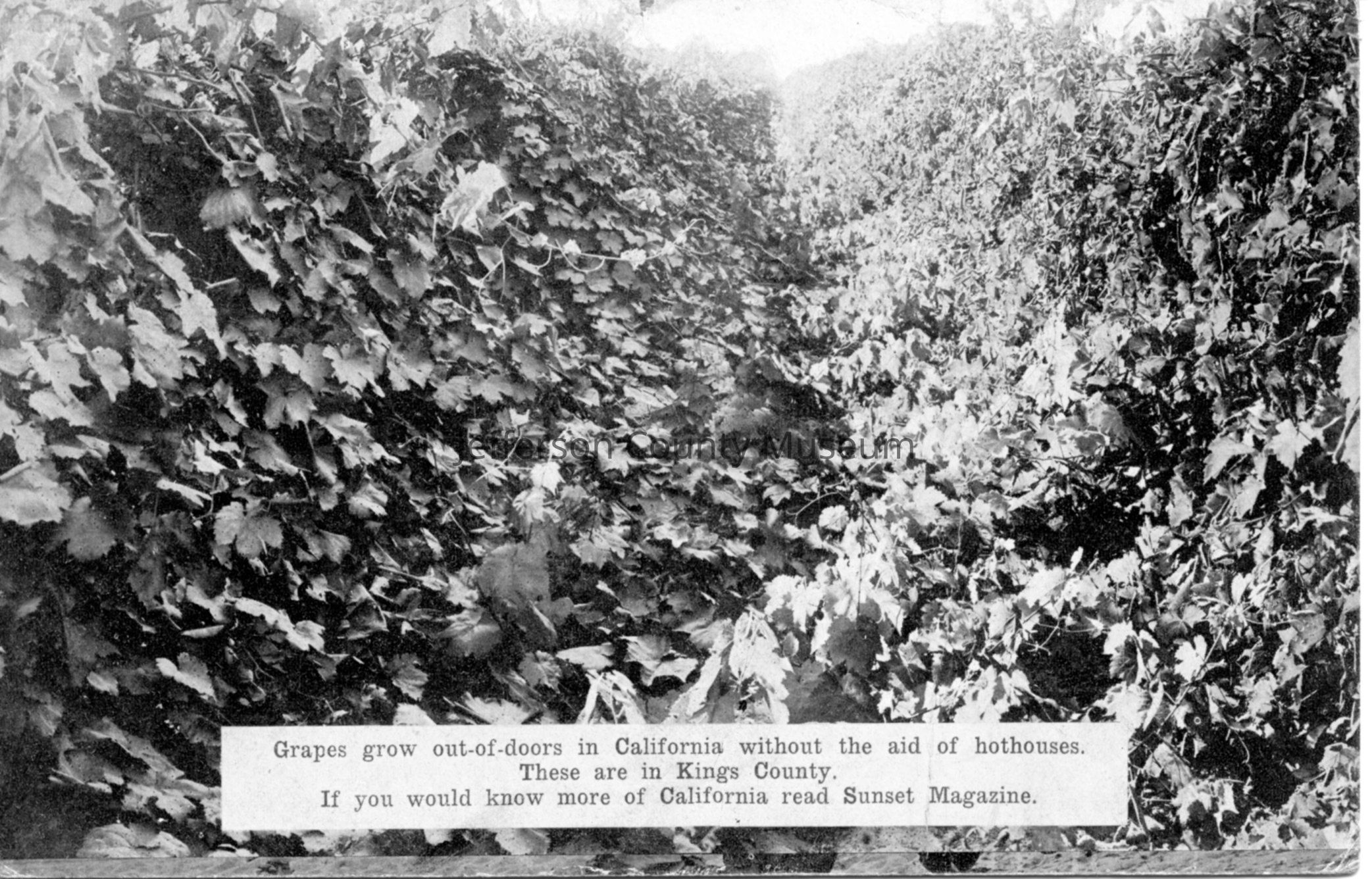 black & white postcard of grapes growing in California, postcard addressed to Angie Gruber from her brother, Joseph M. Gardner of Pacific Grove, California