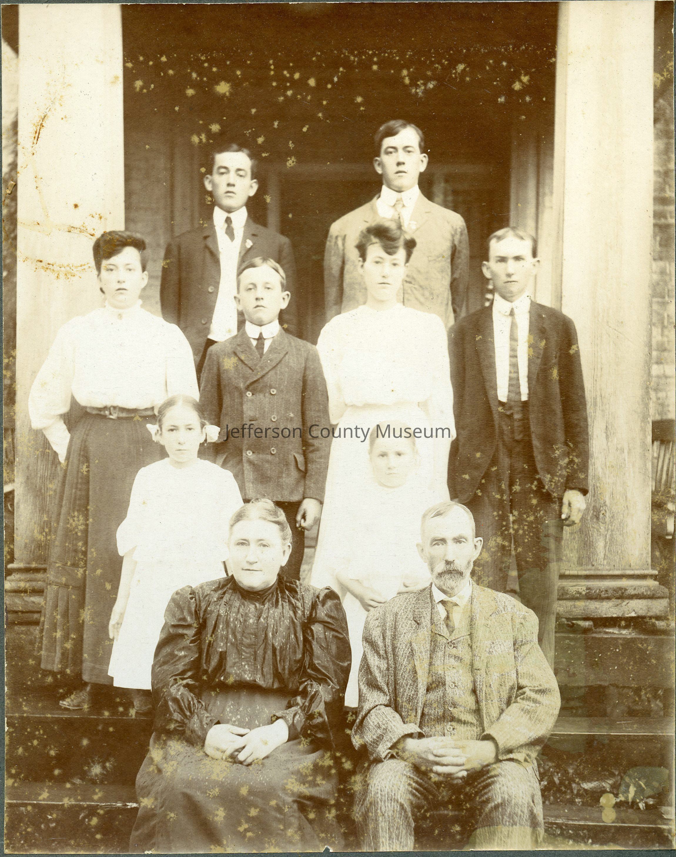 large photo of unidentified family, two seated and three rows standing, on steps at entrance to a building or residence - may be the Orr family of Baltimore, MD -- LOCATED in Flat File 2, Storage Room 2, Drawer 4, Folder 4Acquisition