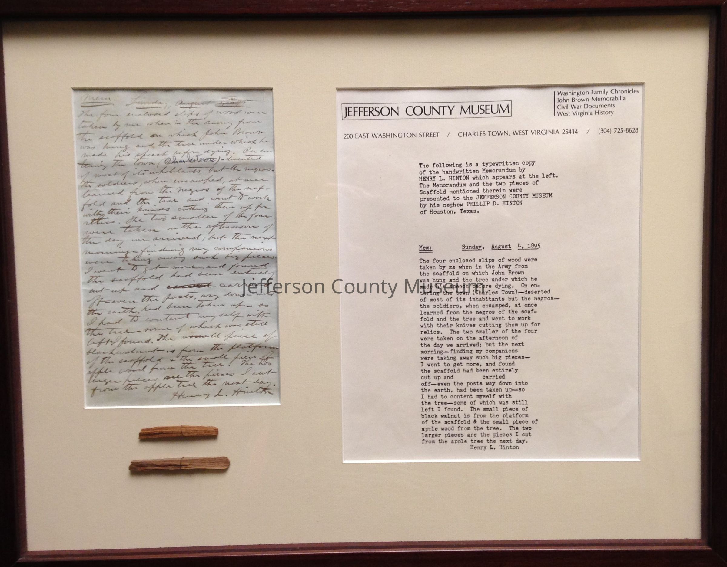 Two thin strips of brown wood, one 2" long and one 2.5" long, said to be from John Brown's scaffold. Included is a handwritten memorandum to their authenticity and a typed transcript of the memorandum on Jefferson County Museum letterhead.Acquisition