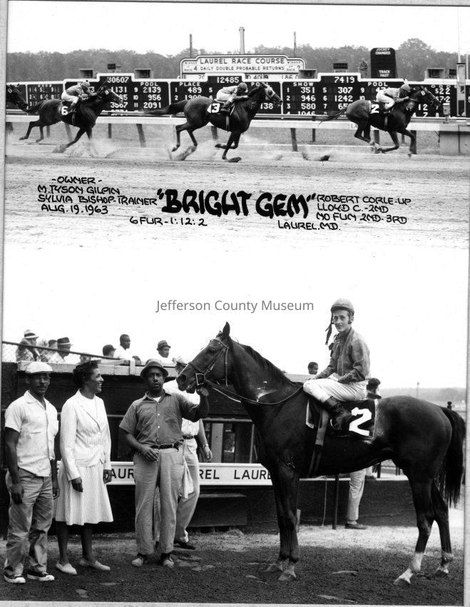 Photo-finish and winner's circle of "Bright Gem". Photos taken at Laurel Race Course, Laurel, MD. Horse owned by M. Tyson Gilpin and trained by Sylvia (Rideoutt) Bishop of Charles Town. Jockey was Robert Corle. Photographer unidentified. Ms. Bishop was the first African American woman licensed as a horse trainer.Acquisition