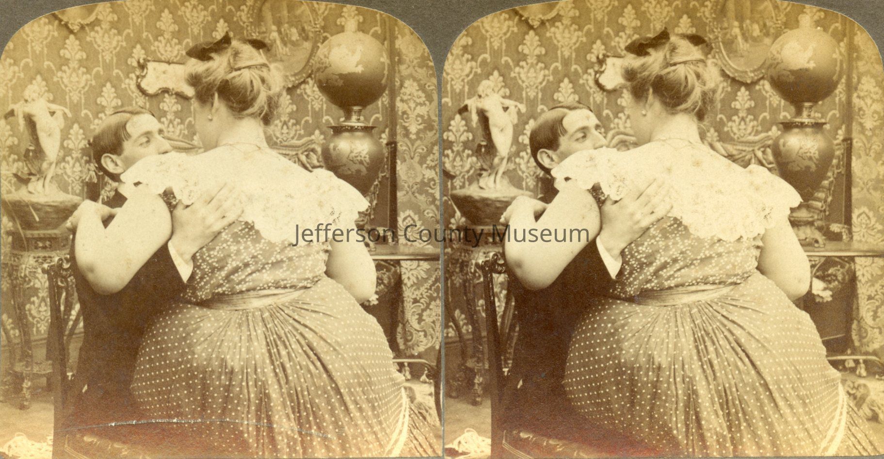Woman in a man's lap entitled "And some have greatness thrust upon them". Copyright 1901Acquisition