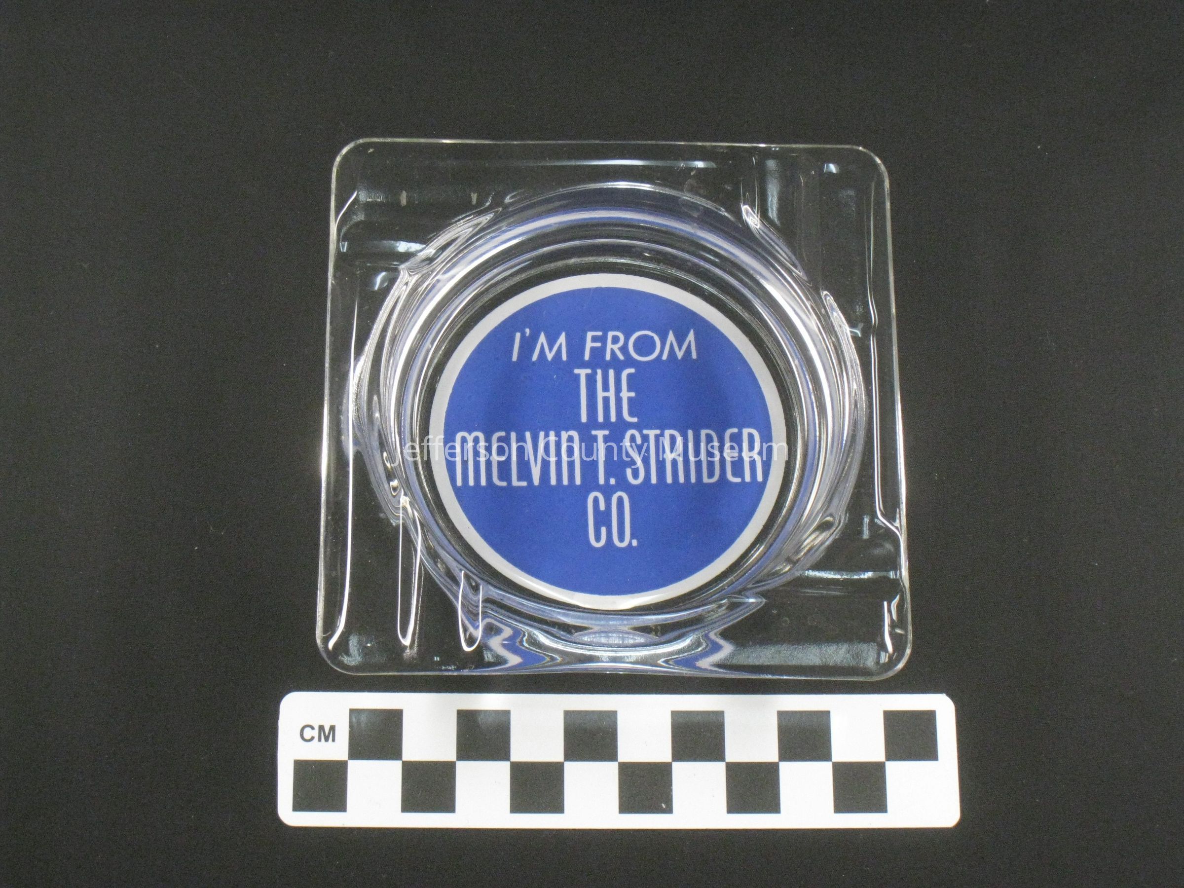 20th century clear glass ashtray with squared border and circular dish, advertising Melvin T. Strider Funeral Home in Charles Town, W.Va. There is a single groove on each corner for resting a cigarette. The underside of the dish is painted blue with a white line border and inverted white text so that it is read through the transparent glass when the ashtray is upright. Text reads: "I'M FROM THE MELVIN T. STRIDER CO."Acquisition