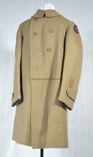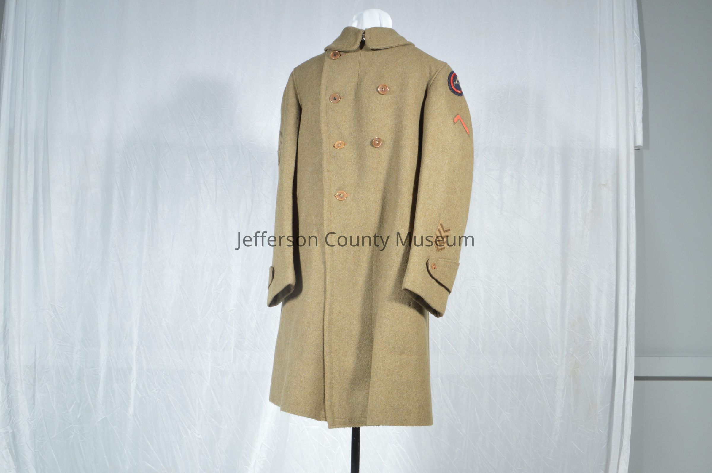 World War I heavy wool olive drab overcoat. Has Third Army patch on left shoulder. The patch is a white "A" with a red circle around it on a dark blue circle. There is a red private first class stripe on the left sleeve and olive drab corporal's stripes on the right sleeve. There are four service stripes at the left cuff indicating the soldier spent two years overseas. Printed inside the collar is "Buckles 15577". Stamped below collar is "U.S."Acquisition