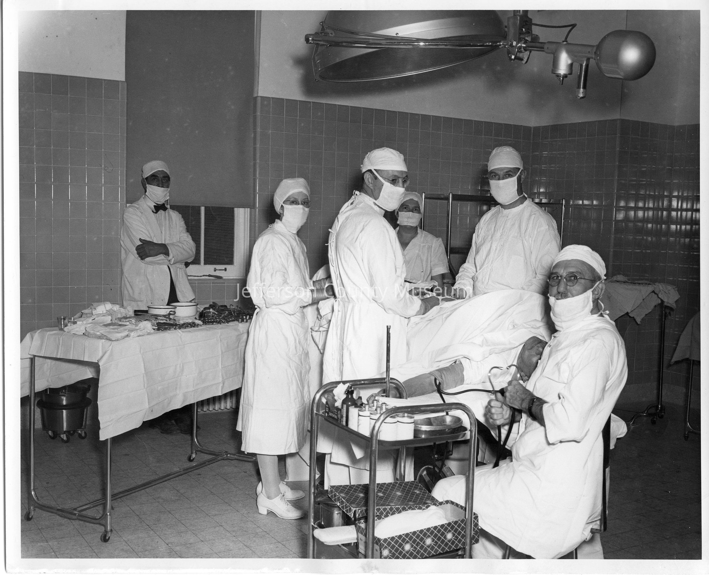 Six doctors and nurses, wearing surgical masks, in operating room. One man, wearing glasses, is seated in right foreground. Also patient on table. The man standing on the left with the bow tie maybe John Berry, orderly (identified by Doug Perks, JCM Historian). Operating room probably in old Charles Town Hospital in Ranson.Acquisition