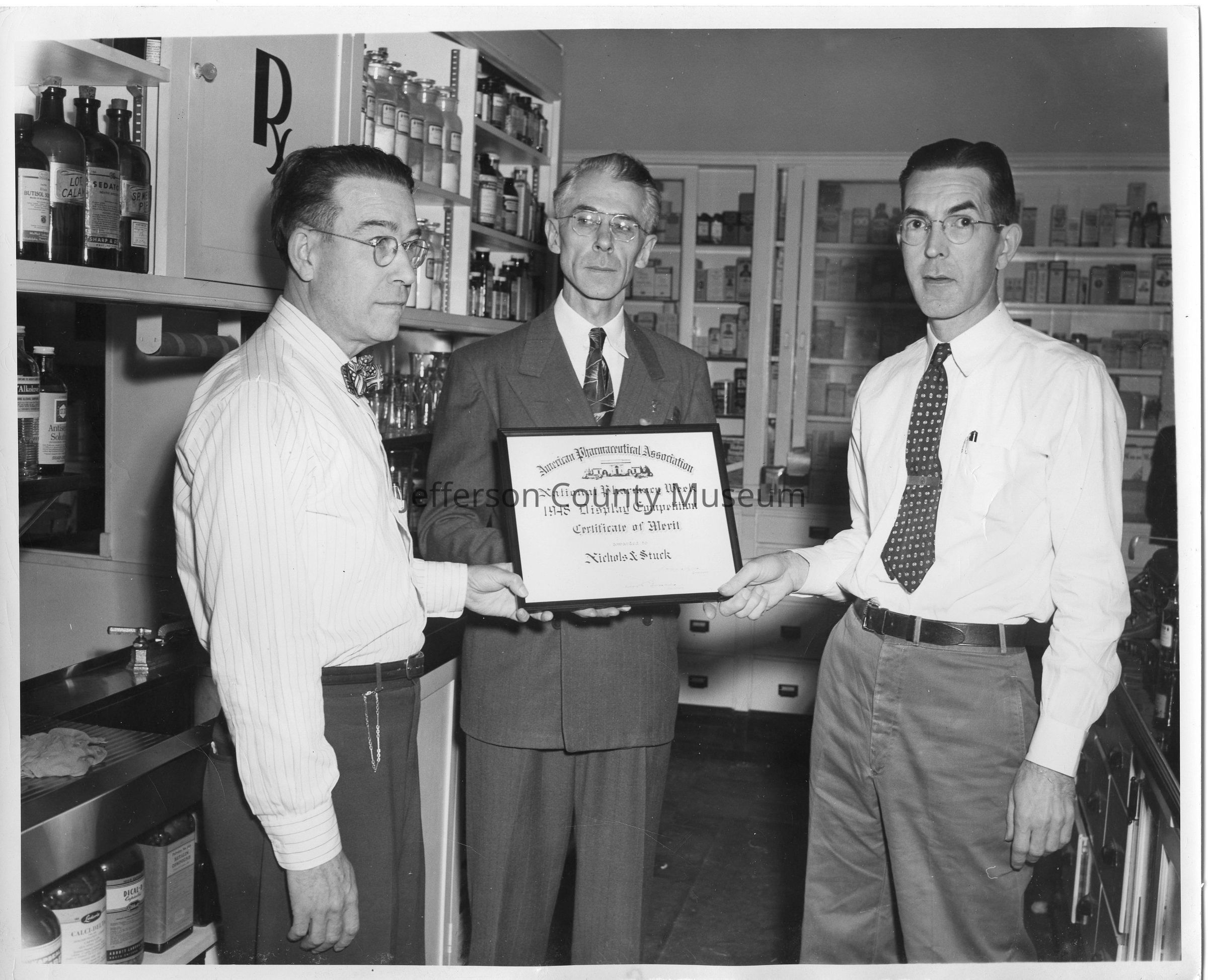 IMG3450-1: Black & white photo of three men holding a framed certificate commemorating National Pharmacy Week, 1948 Display Competition. On left is William Bay Stuck, on right is Daniel Shirley Nichols. Man in center is unidentified.