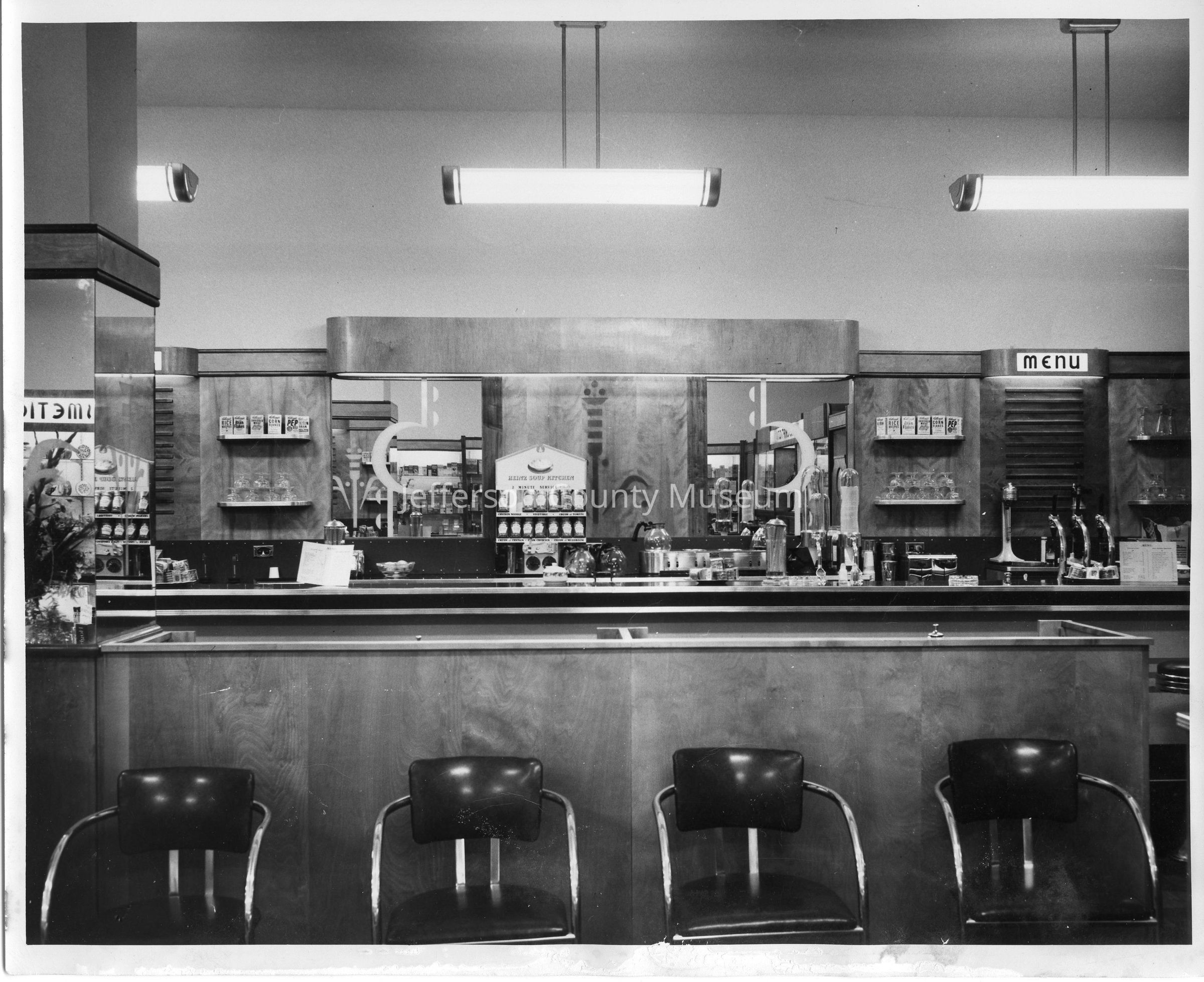 IMG3450-2: Black & white photo of lunch counter at Nichols & Stuck Drug Store, c1947-48. Photo is duplicate of IMG1695.