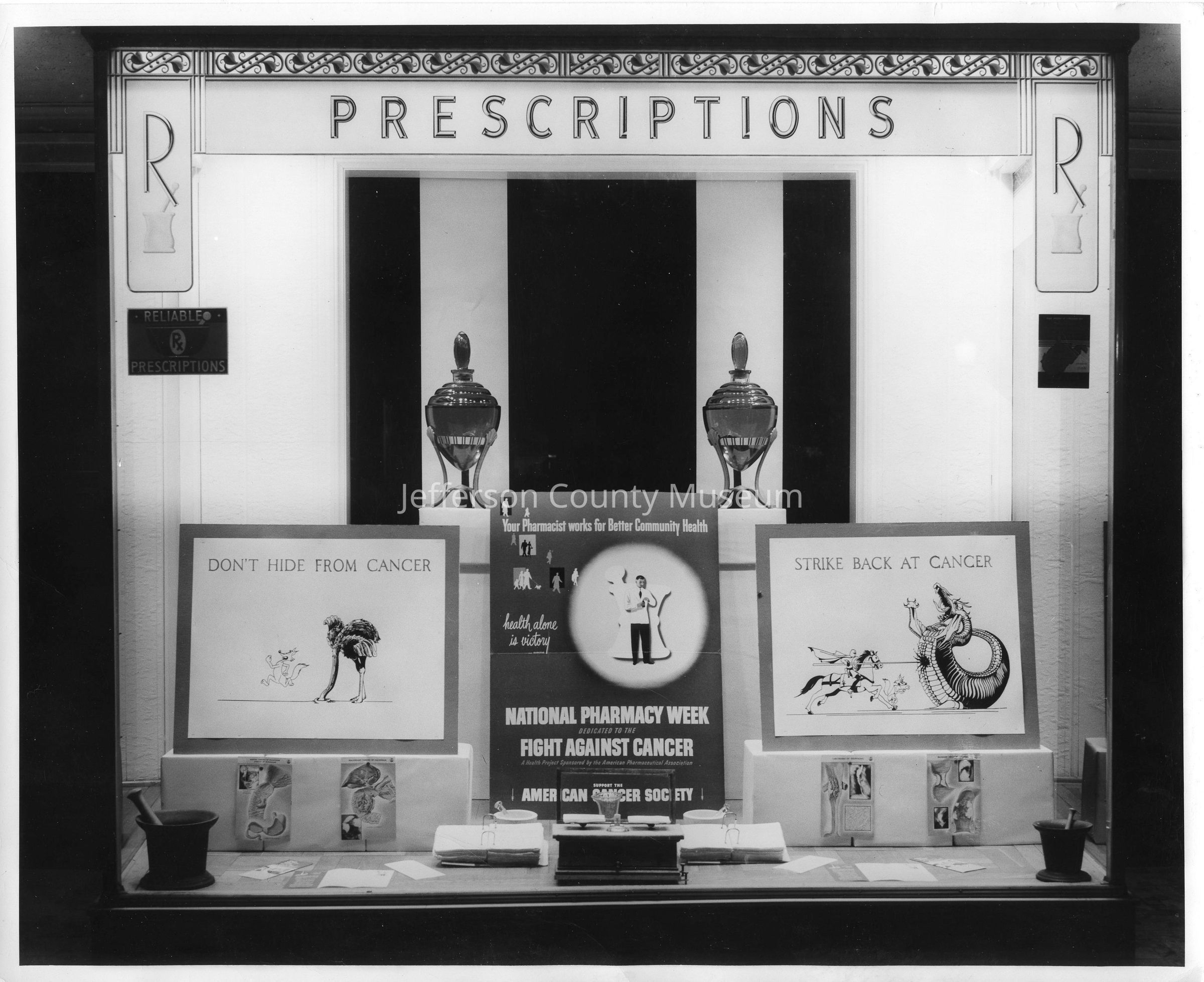 IMG3450-3: Black & White photo of interior of Nichols & Stuck Drug Store, National Pharmacy Week Display about cancer.