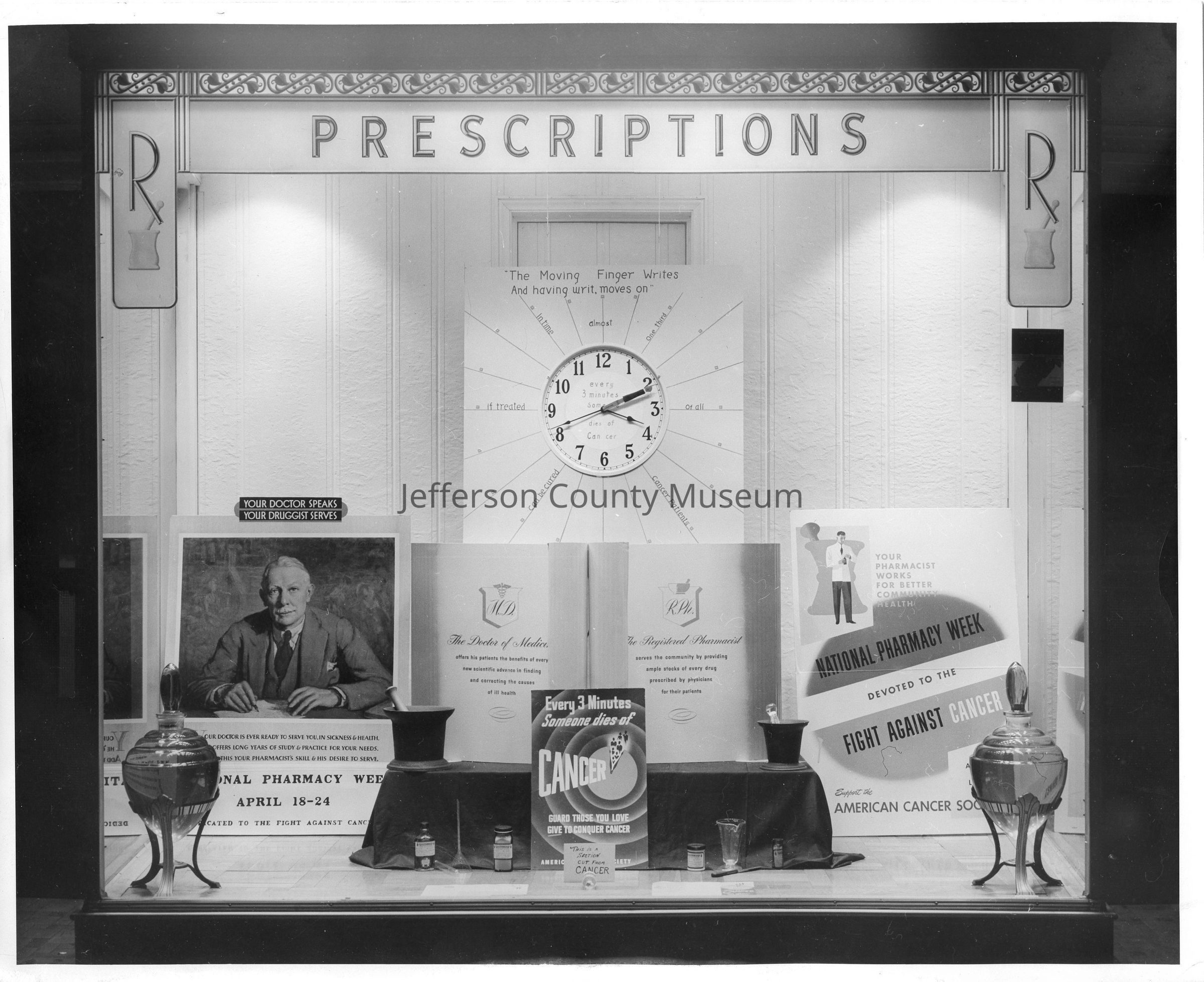 IMG3450-4: Black & white photo of interior of Nichols & Stuck Drug Store, National Pharmacy Week Display about cancer, with clock in background.