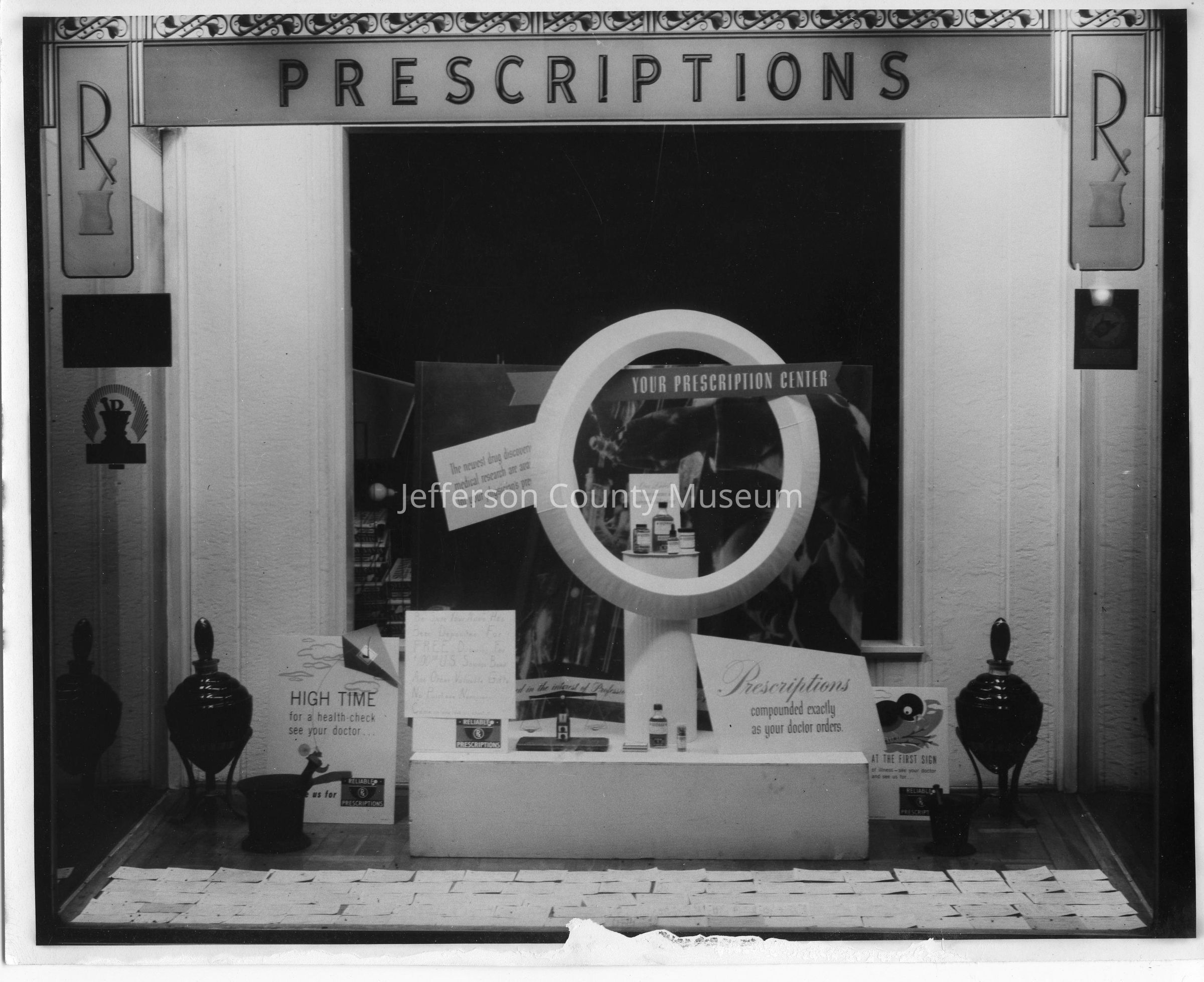 IMG3450-5: Black & white photo of interior of Nichols & Stuck Drug Store, prescription counter display.