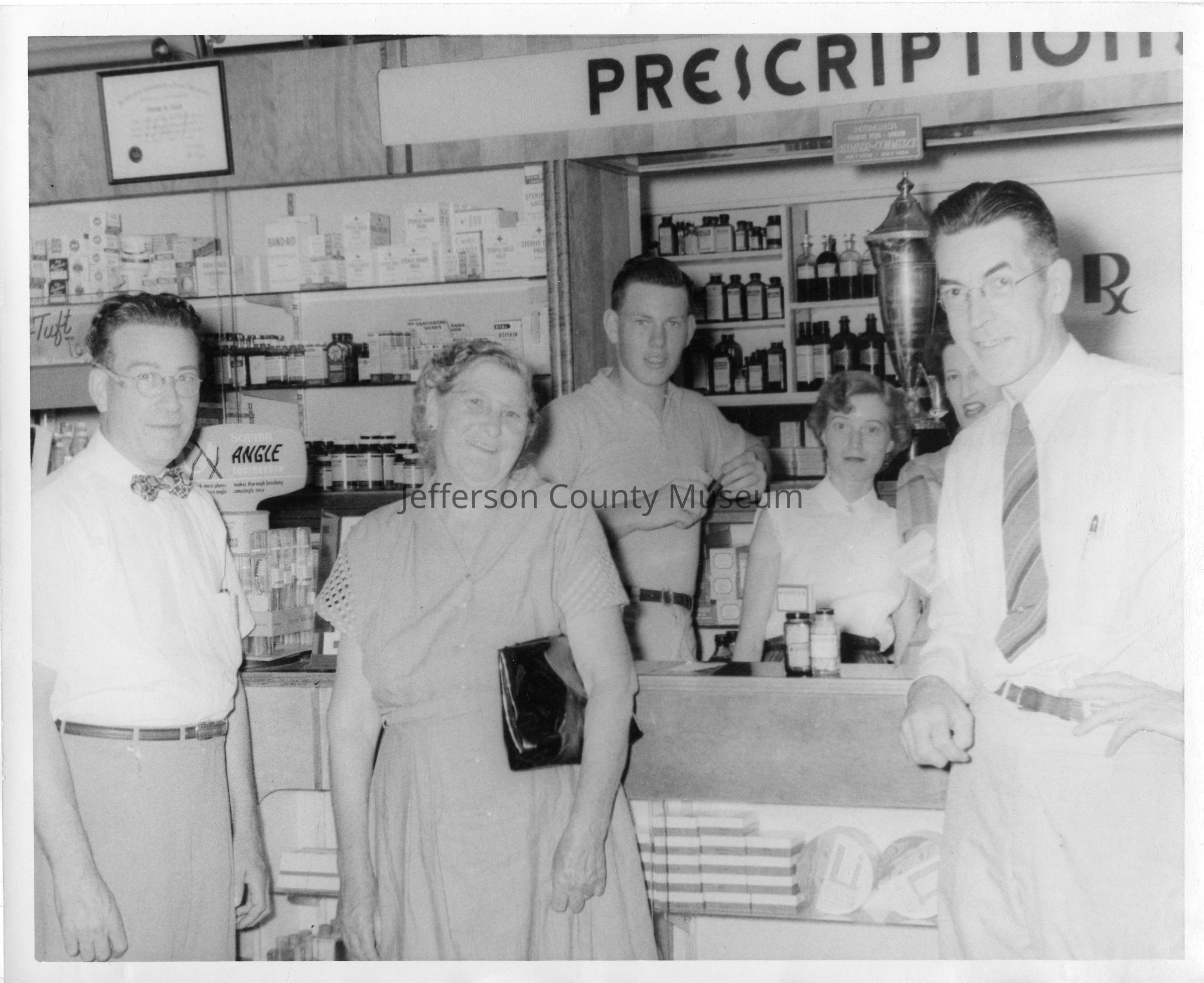 IMG3450-6: Black & white photo of six people at the prescription counter at Nichols & Stuck Drug Store.