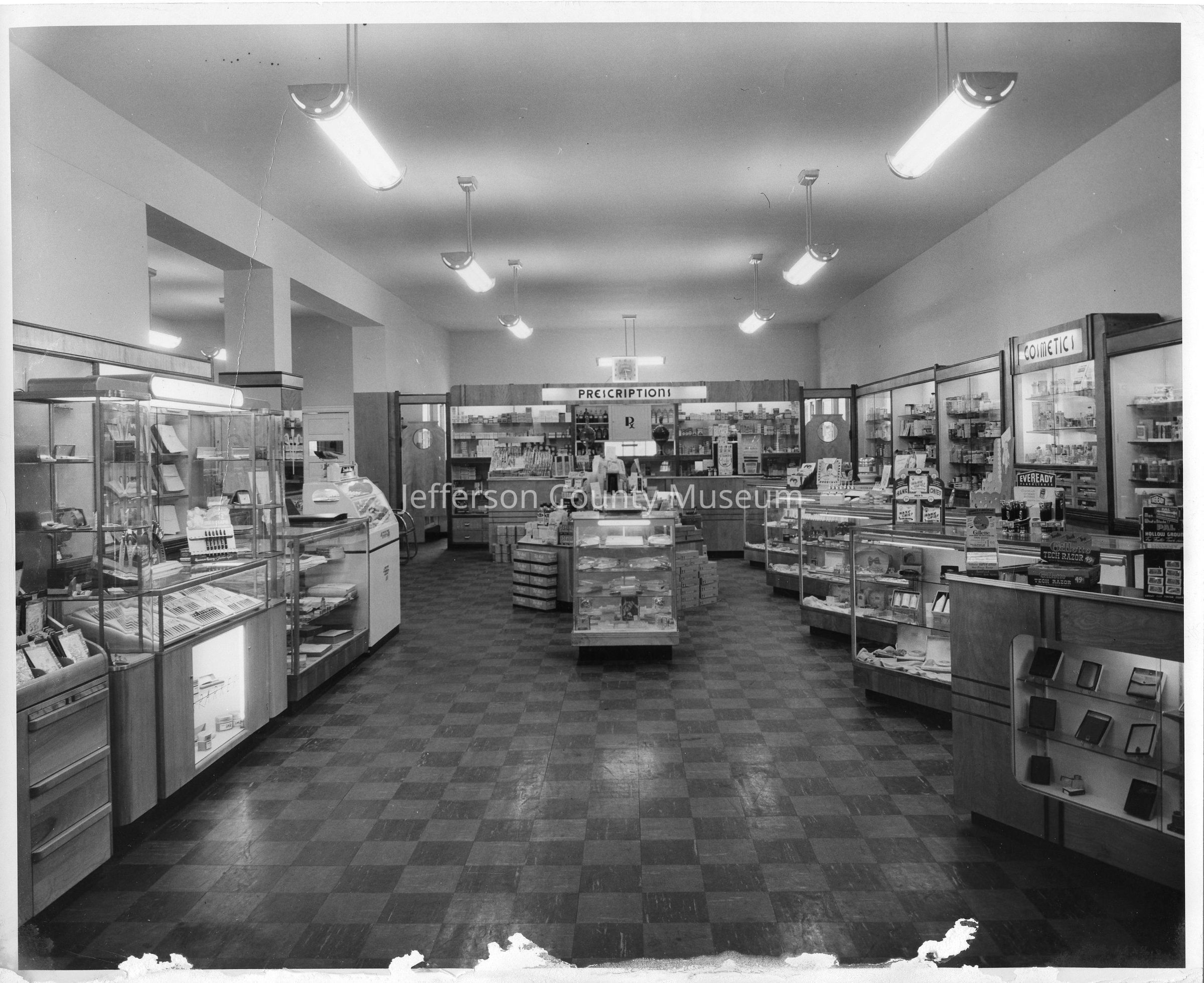 IMG3450-7: Black & white photo of interior of Nichols & Stuck Drug Store, taken from front door toward prescription counter and showing display cases along each wall and center aisle. Photo is duplicate of IMG1737.