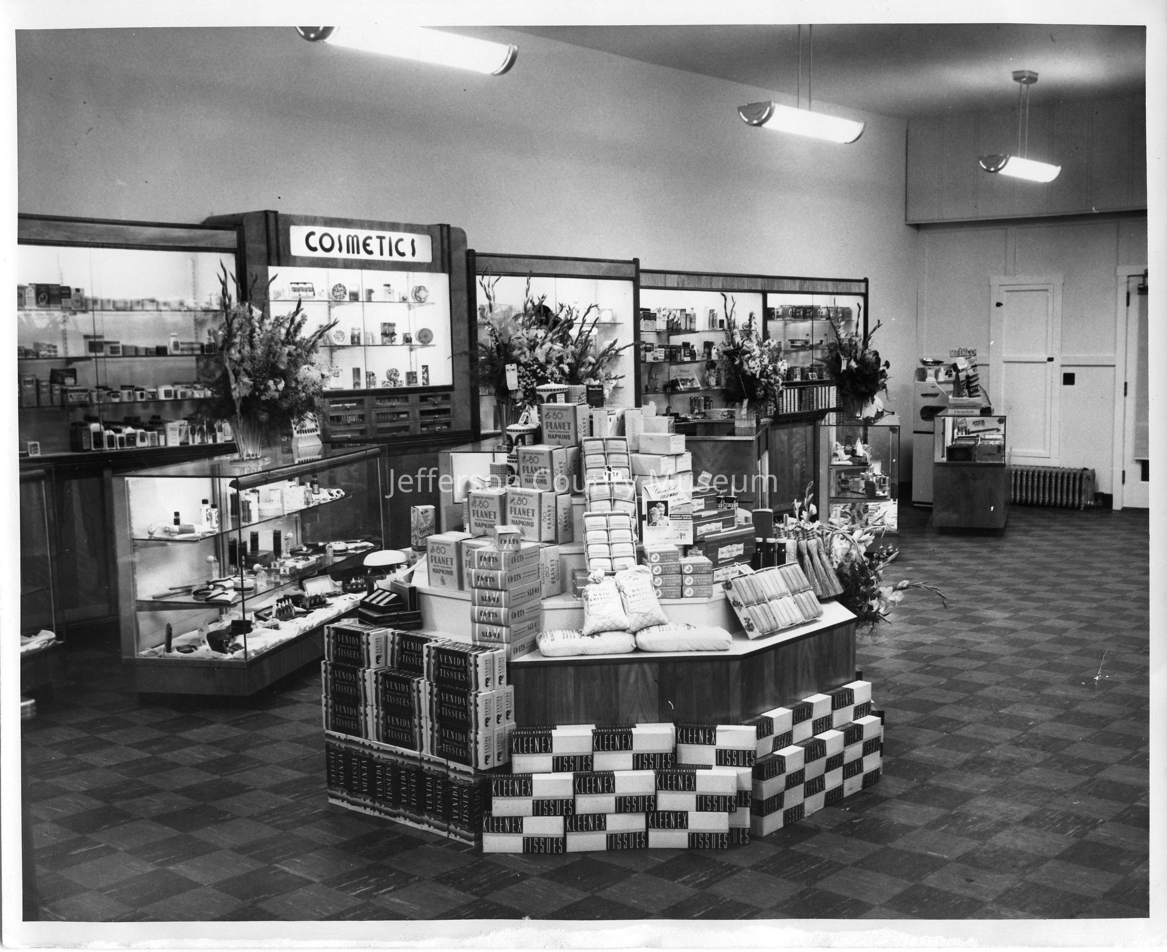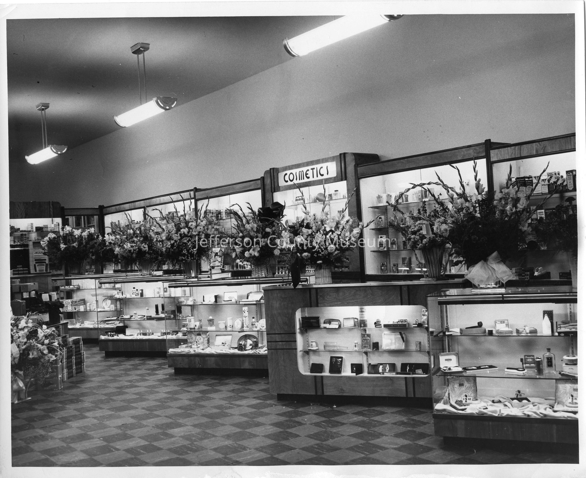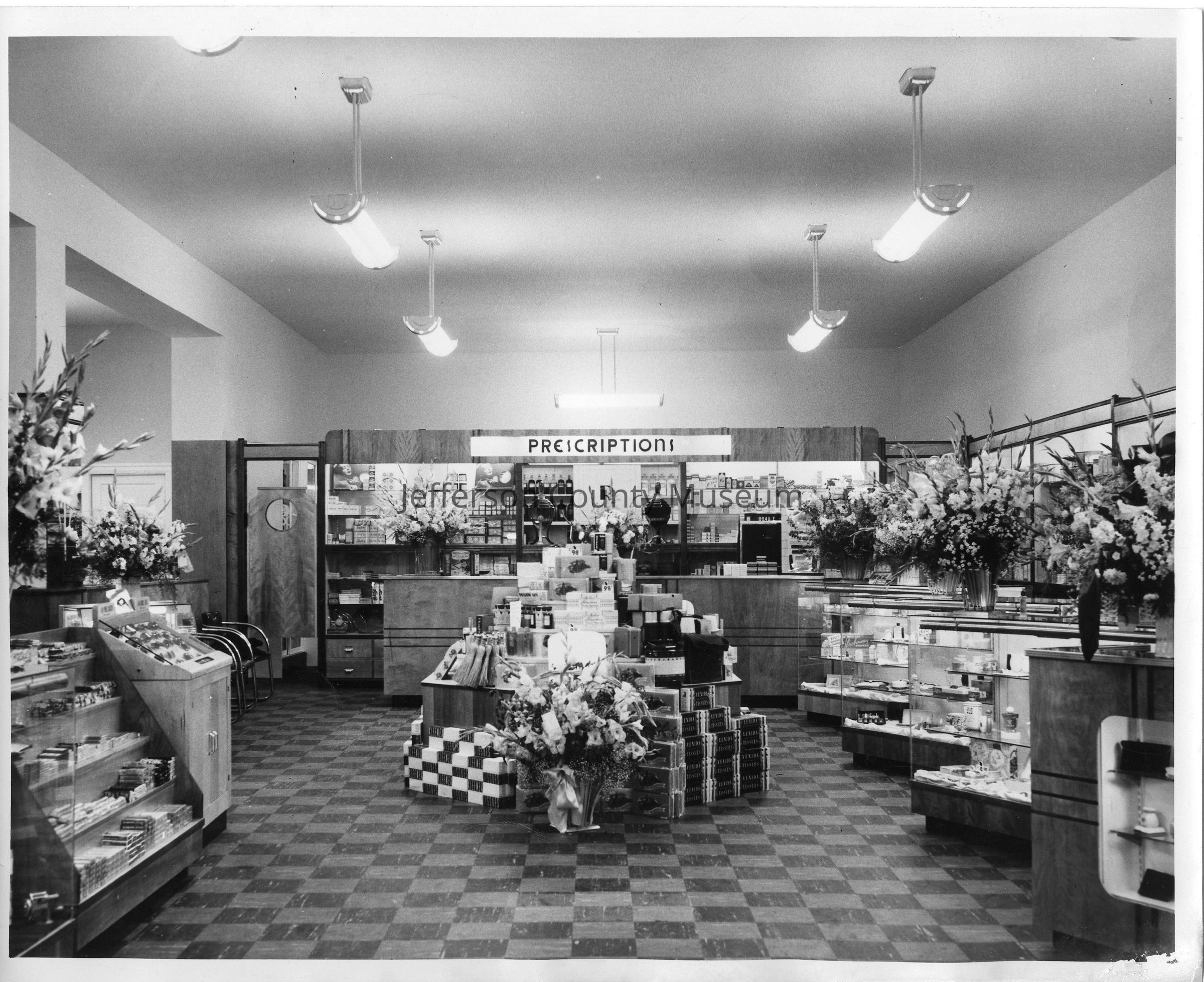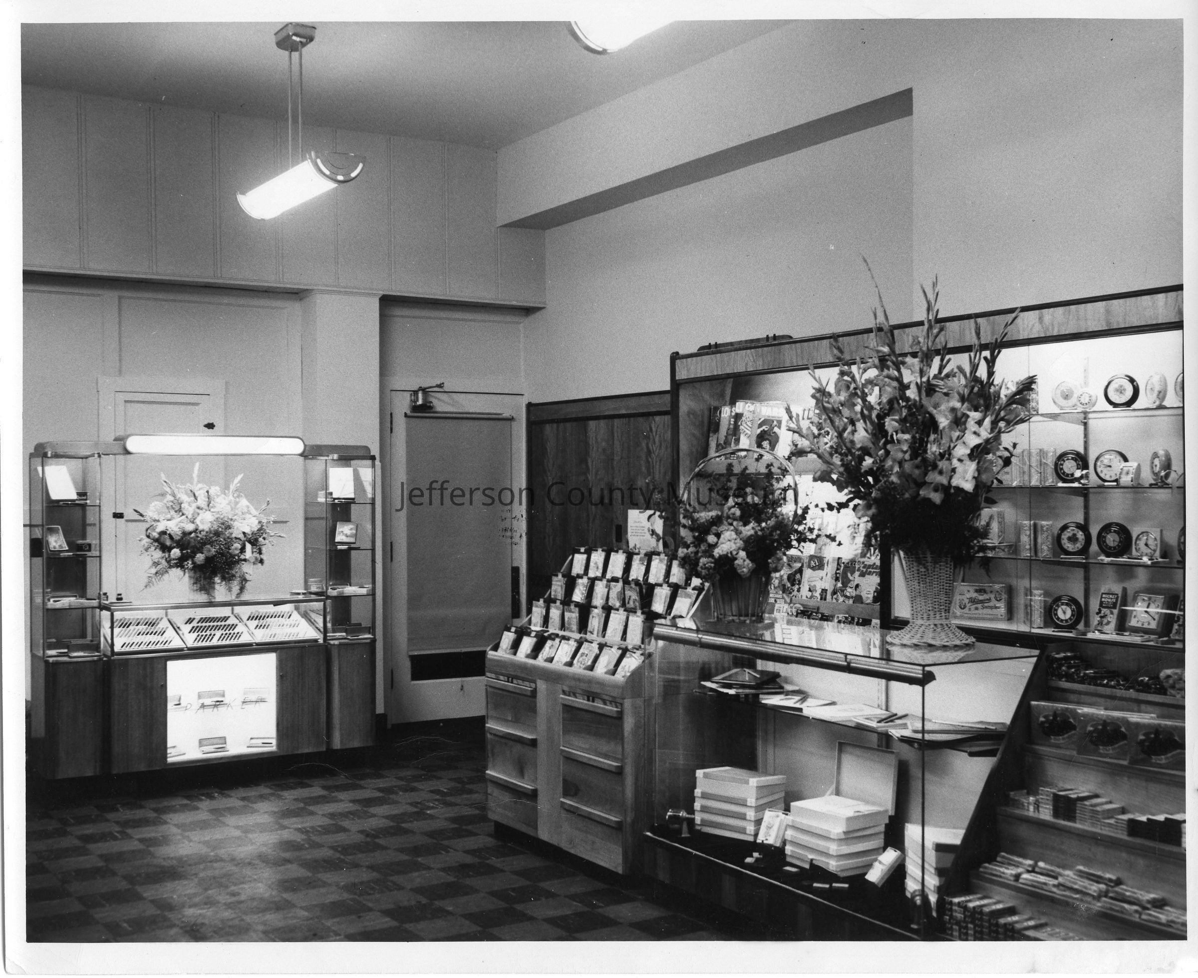 IMG3450-8: Black & white photo of interior of Nichols & Stuck Drug Store, showing display cases along east wall with vases of flowers; taken during grand opening. Photo is duplicate of IMG1695.