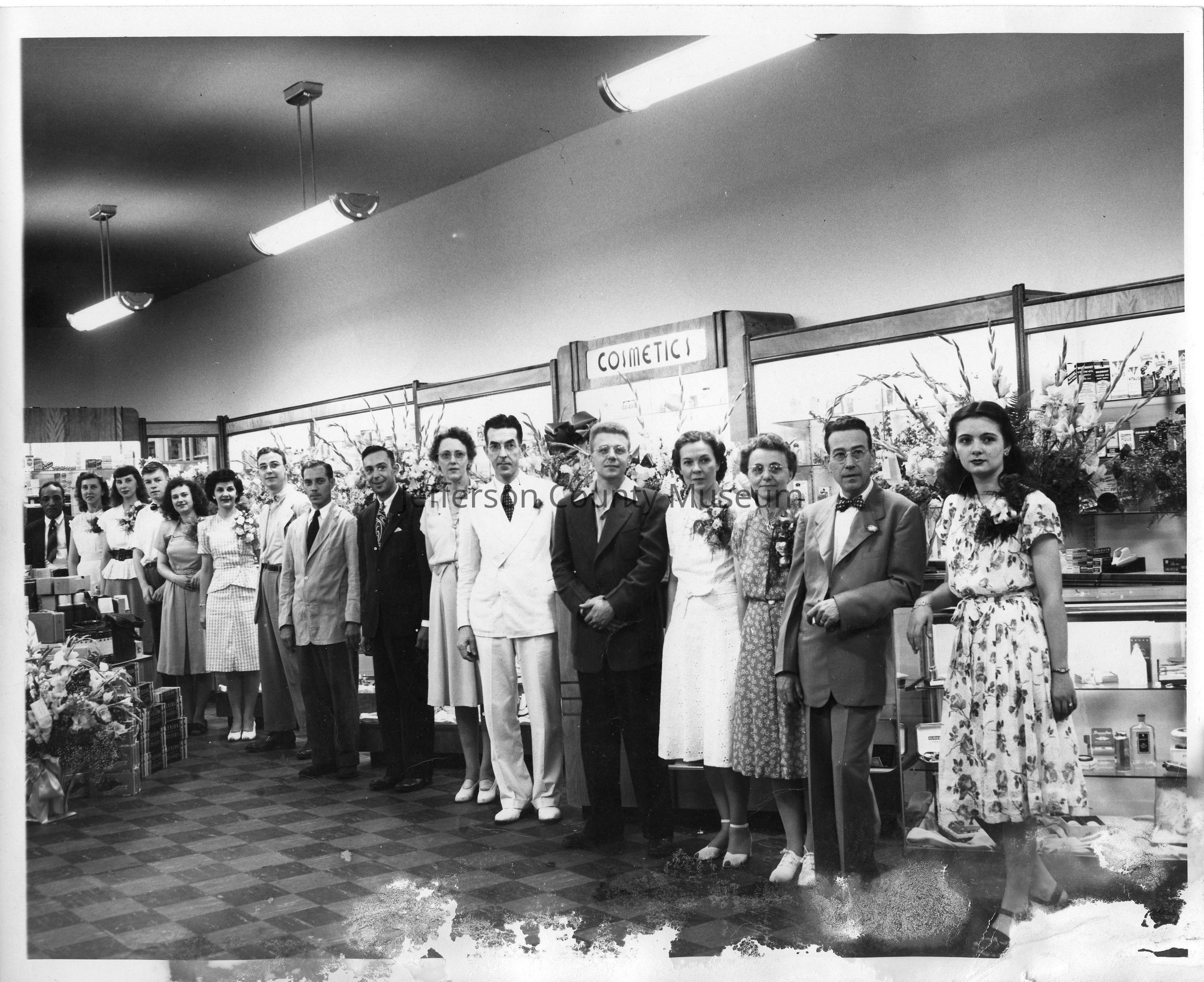 IMG3450-12: Black & white photo of Nichols & Stuck Drug Store pharmacists and employees lined up along east wall, taken during grand opening. Photo is duplicate of IMG1695. Left to Right: