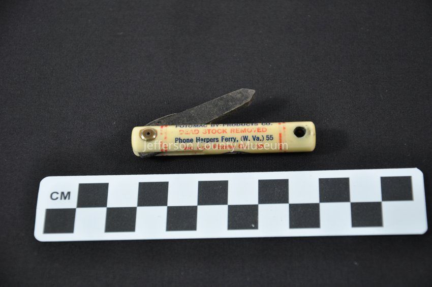 A cylindrical plastic item, originally attached to a key ring (missing), advertising Potomac By-Products Co., a Harpers Ferry business. Has a swiveling cardboard (?) pick or key in its center, held in place with a screw. Double red stripes encircle the cylinder on either end, with a dark blue silhouette of a horse's head in a circular frame on one side of the cylinder's center. Text on the keychain reads: POTOMAC BY-PRODUCTS CO. DEAD STOCK REMOVED Phone Harpers Ferry, (W.Va.) 55 We Pay Phone Charge PAT. 2,059,8 (3?)17.Acquisition