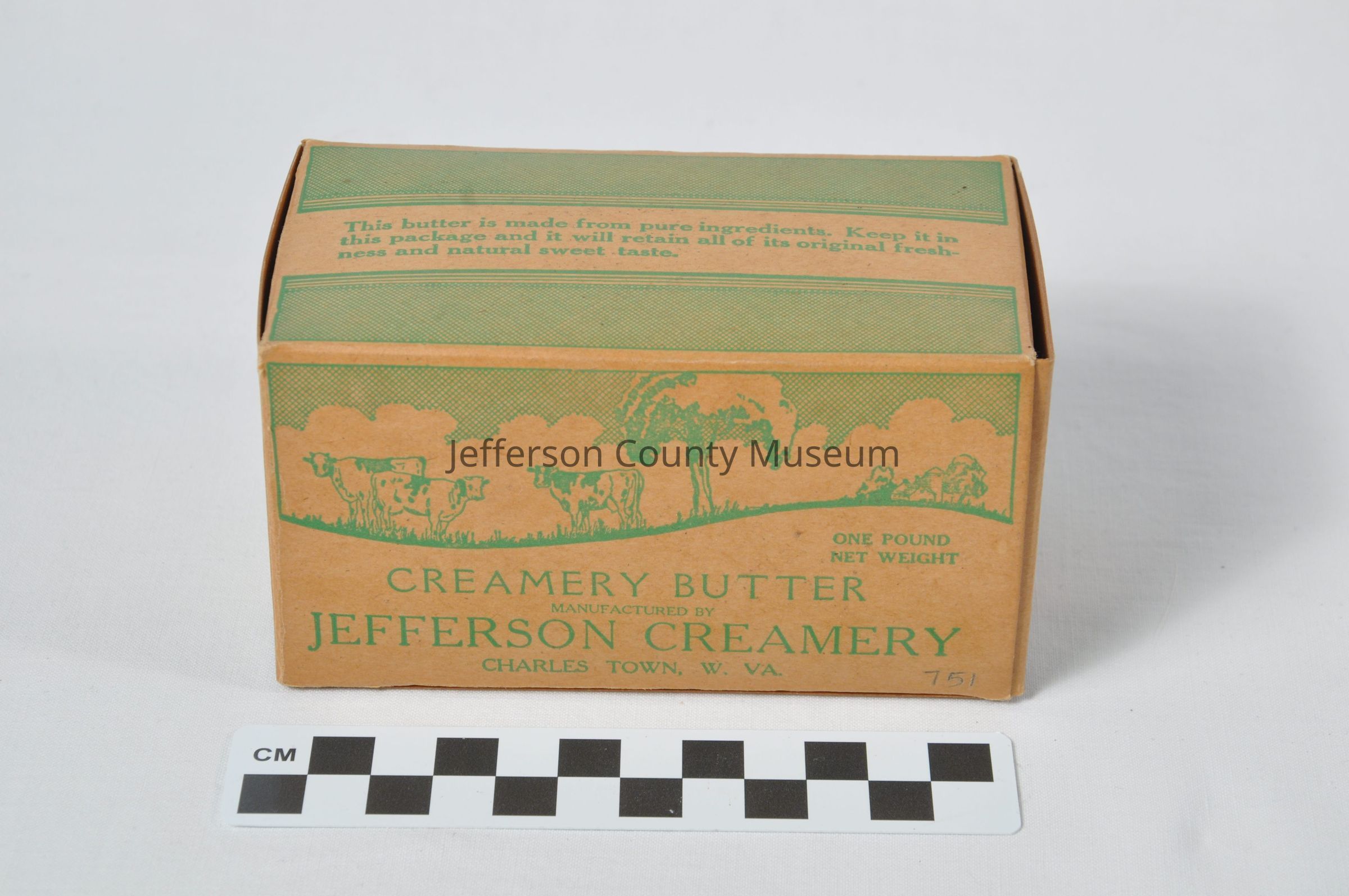 20th Century wax coated, heavy paper box used to contain butter. Green printing and decoration. On top of box is scene with 3 cows, trees, clouds and a farm in background. Text reads: ONE POUND NET WEIGHT CREAMERY BUTTER MANUFACTURED BY JEFFERSON CREAMERY CHARLES TOWN, W. VA.. On both side of box is reads: This butter is made from pure ingredients. Keep it in this package and it will retain all of its original freshness and natural sweet taste. On both ends of box: ONE POUND NET WEIGHT and in script "Butter".Acquisition