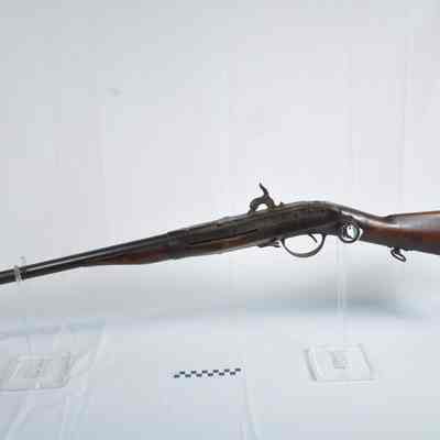 Model 1841 Hall rifle. Marked on top of breech block "H. FERRY US 1841". Metal saddle ring on left side of stock. Front of stock crudely cut down to shorten it.