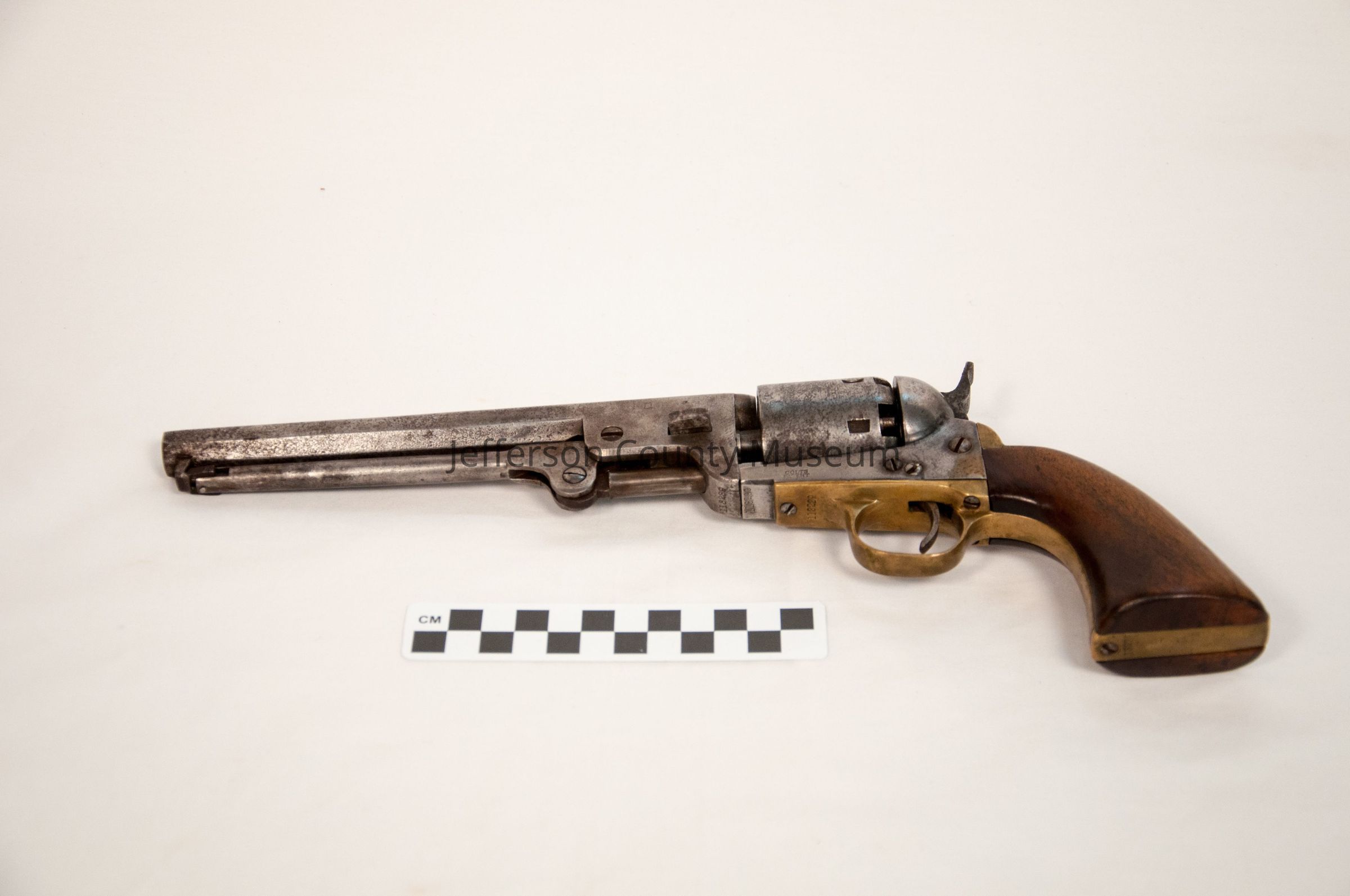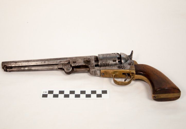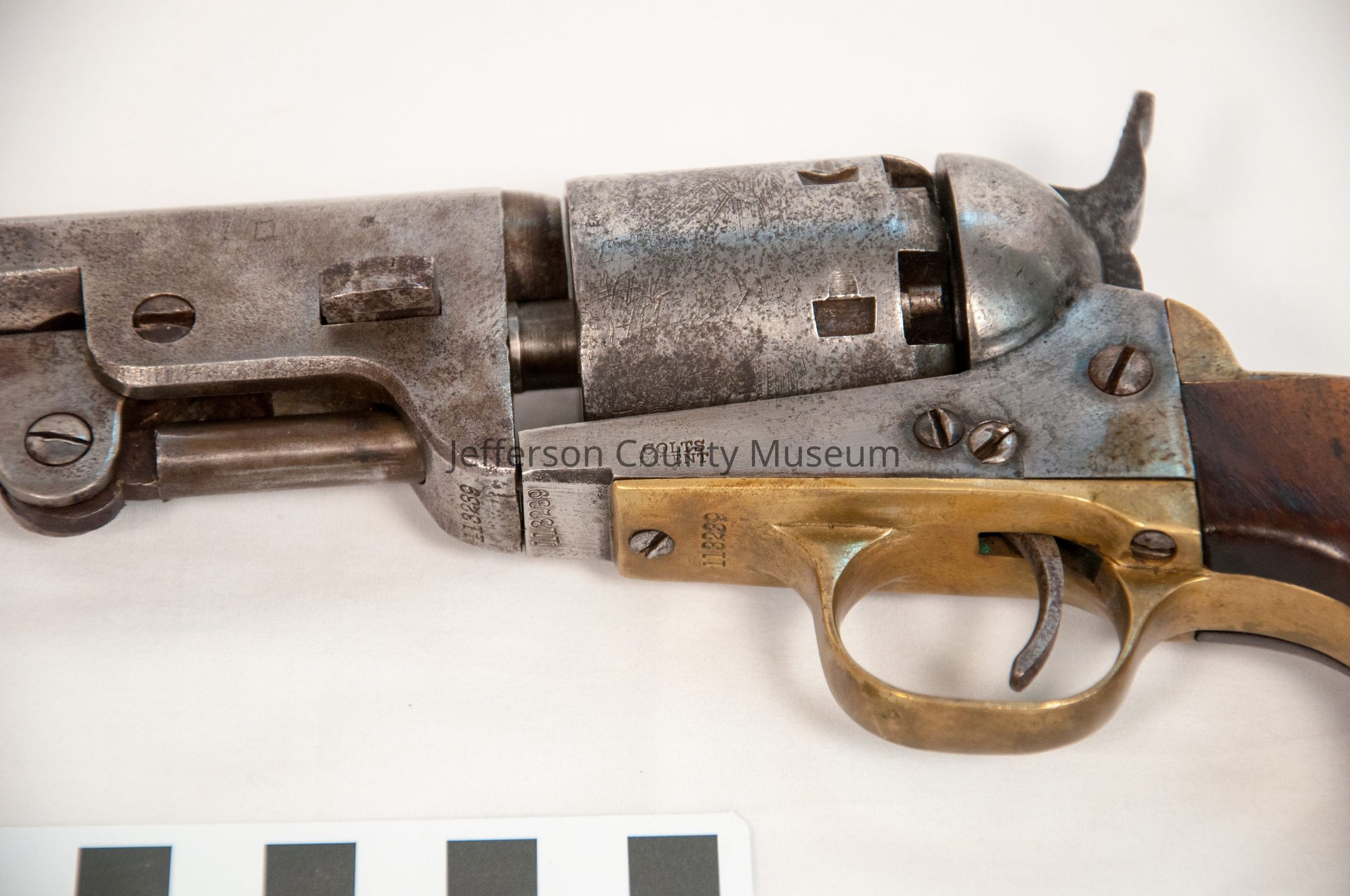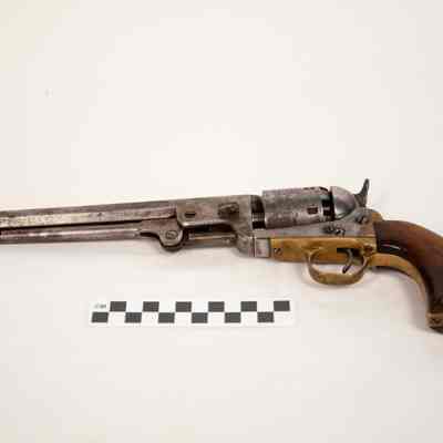 Colt Model 1851 Navy revolver serial no.113289. Octagon barrel. Marked on top of barrel "--ADDRESS COL. SAML COLT NEW -- YORK U.S. AMERICA --".On left below cylinder "COLTS PATENT".