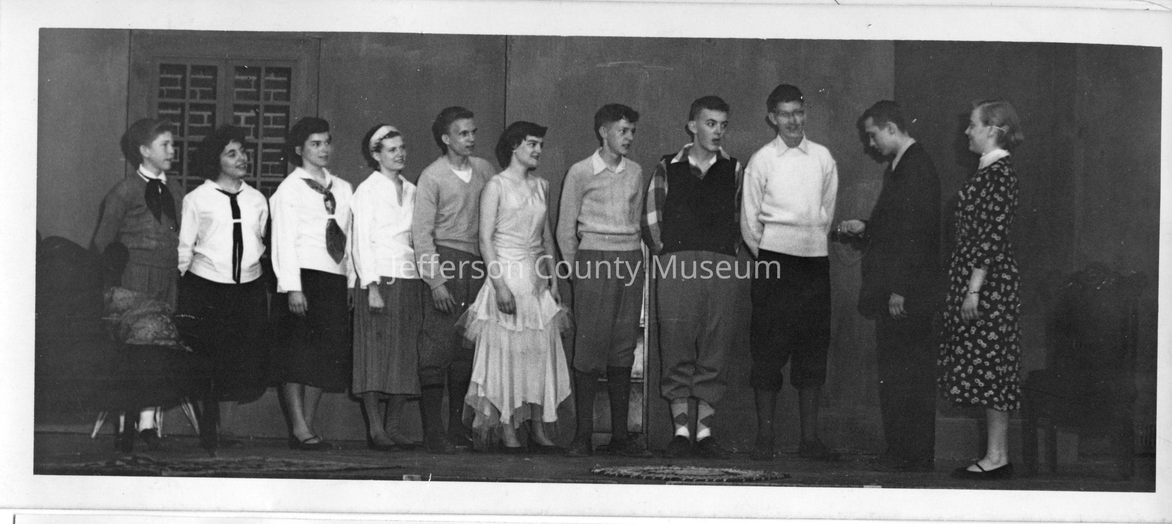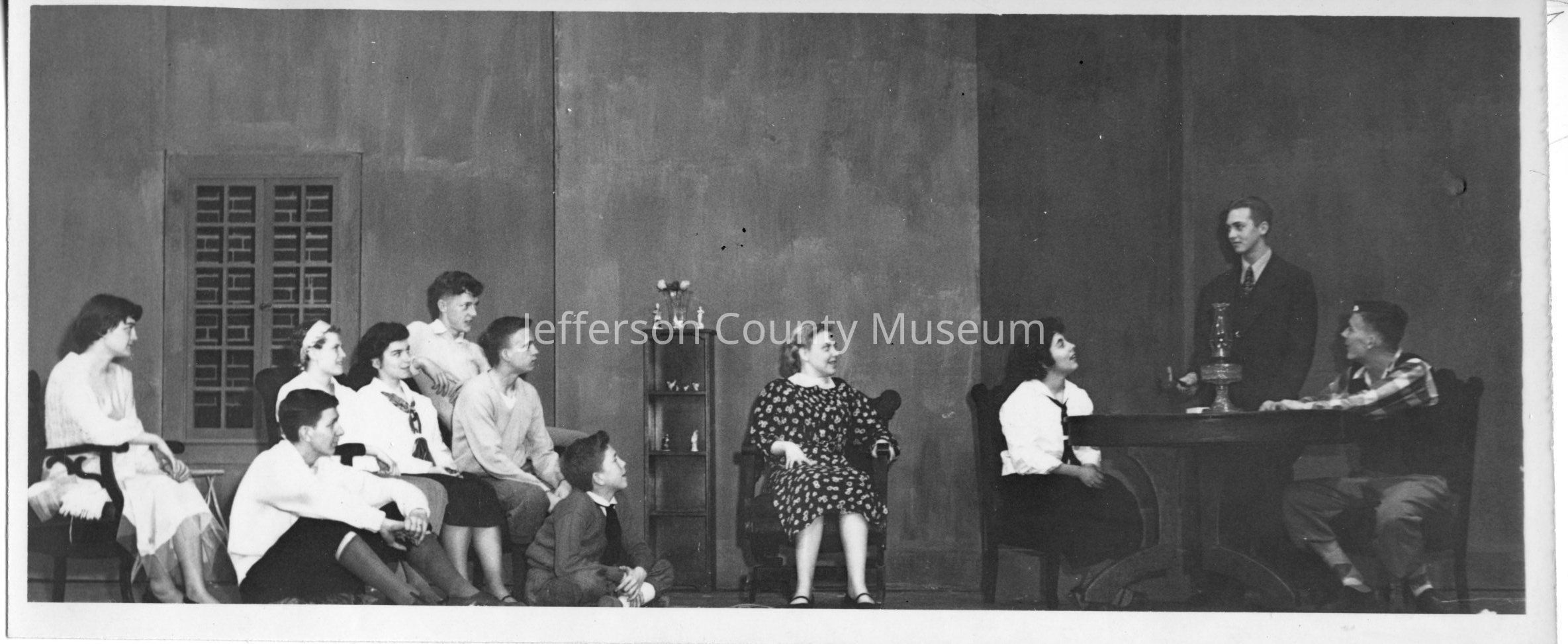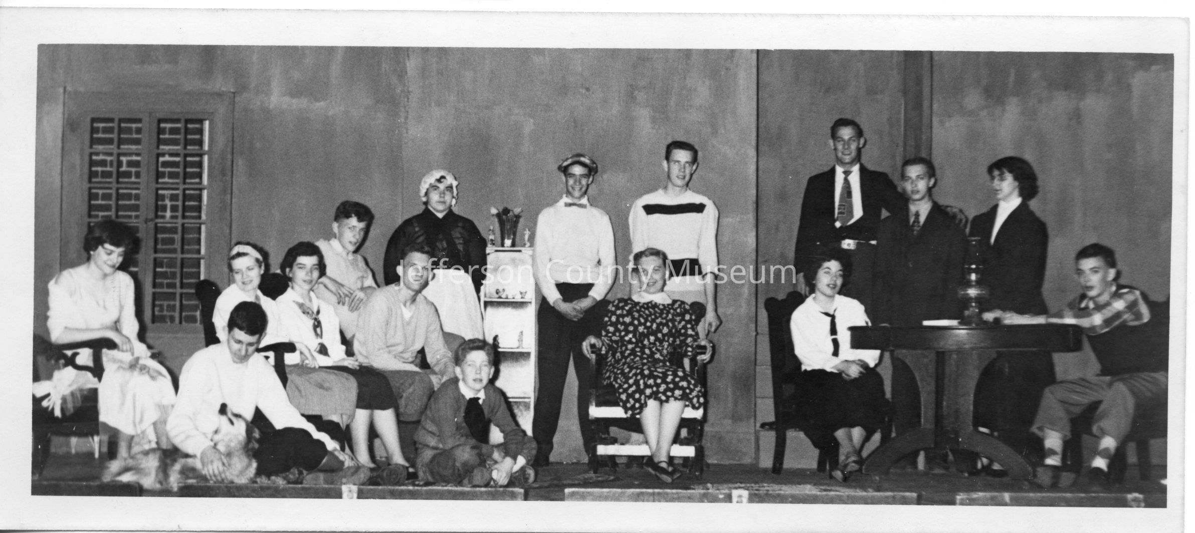 3 photos of the senior play, handwritten on reverse of one of the photos: "'Cheaper by the Dozen' / Senior play / April, 1954"