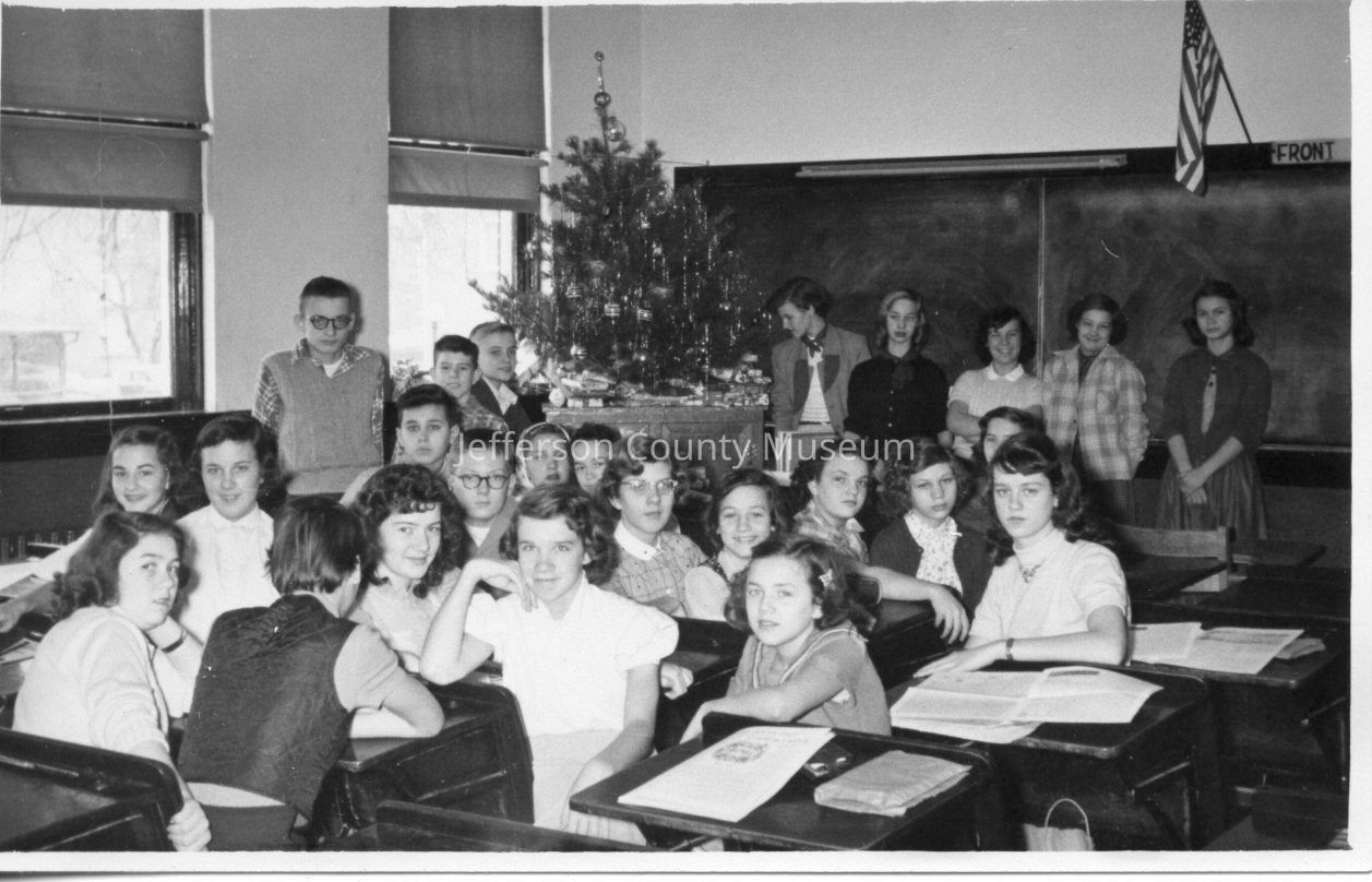 Photo of children in classroom, handwritten on reverse: "8th grade / Christmas, 1954"