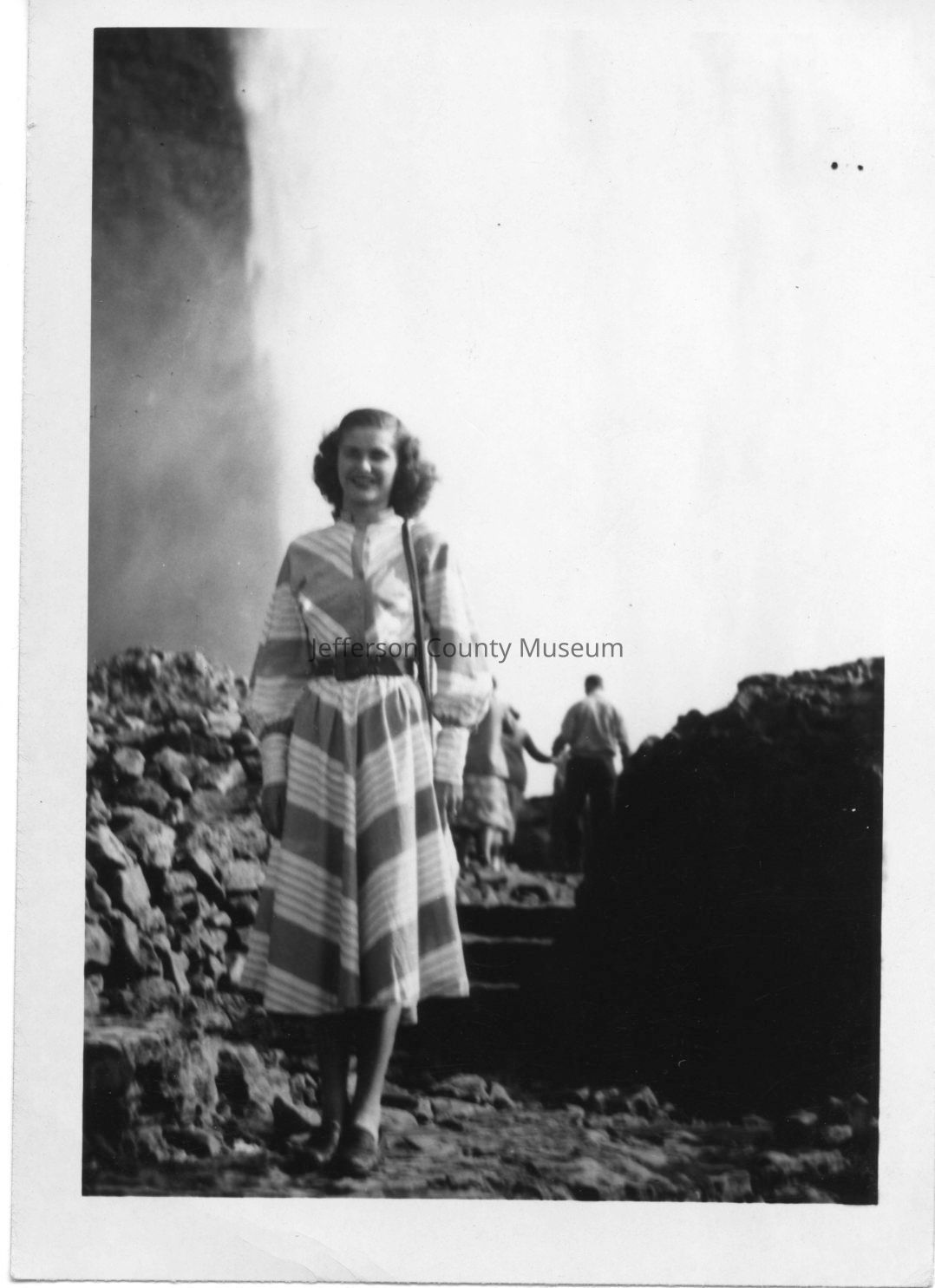 Undated photo of M.L.M.S., wearing a chevron-striped dress and standing by what appear to be rocky outcroppings