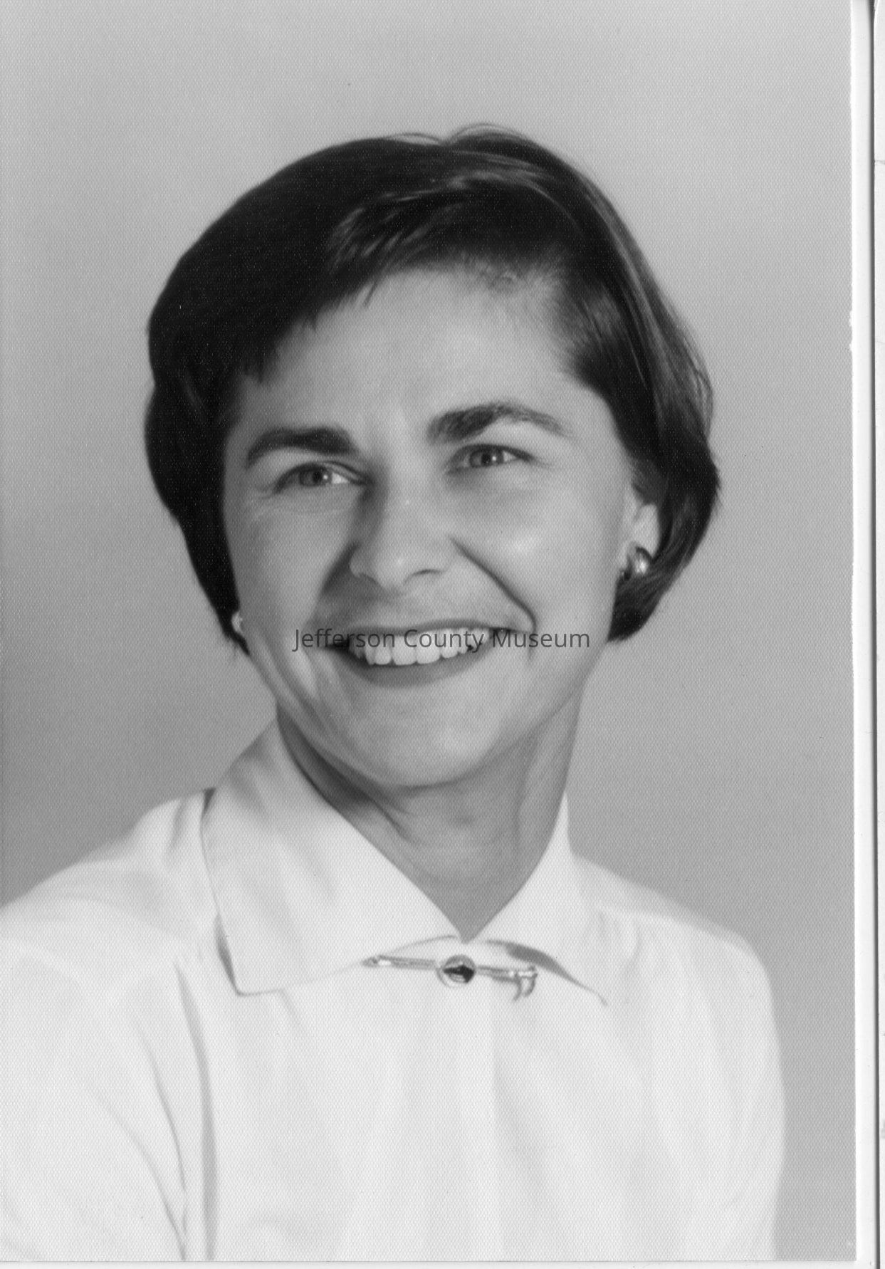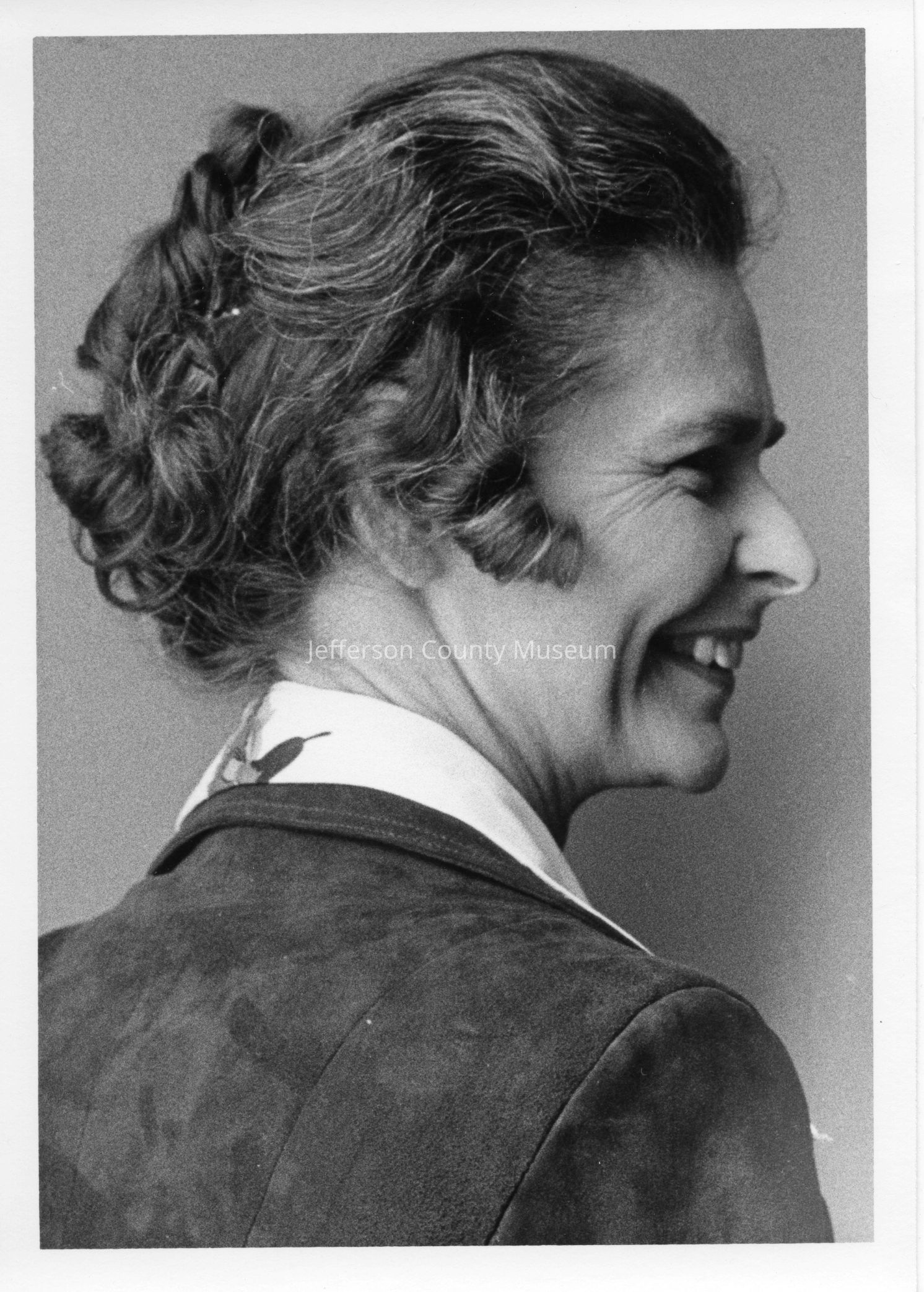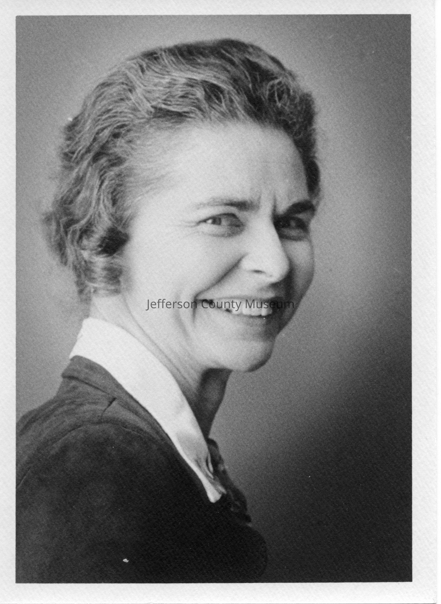 Undated photo of M.L.M.S. with short hair and wearing white blouse with horse bar pin at throat