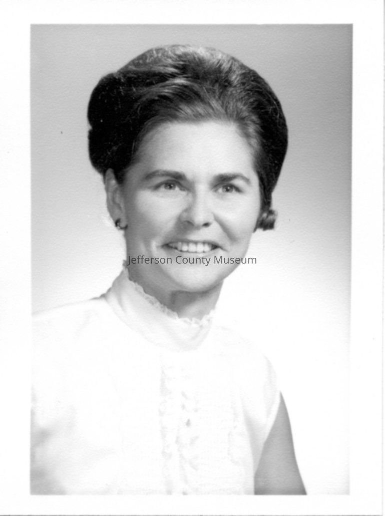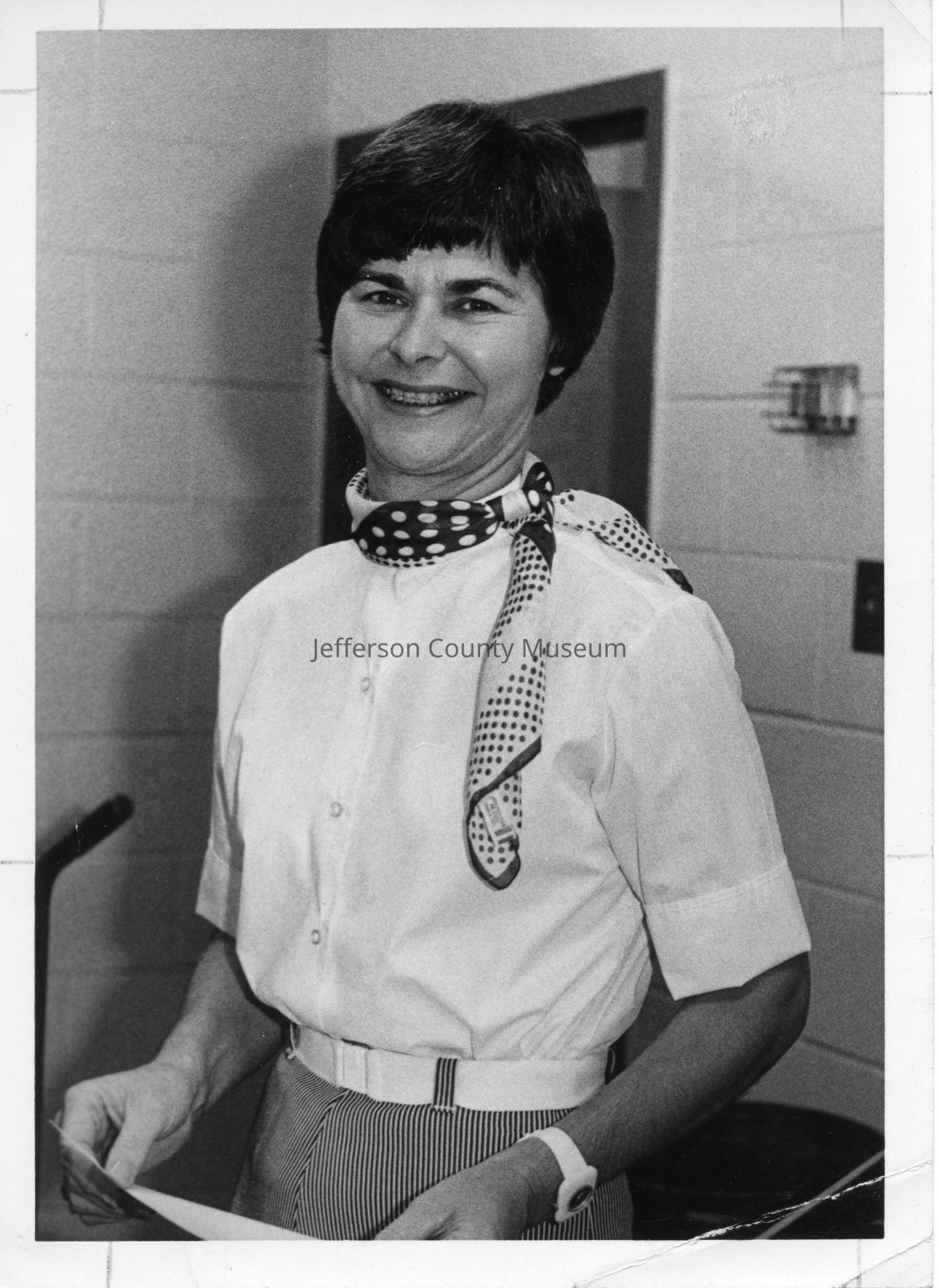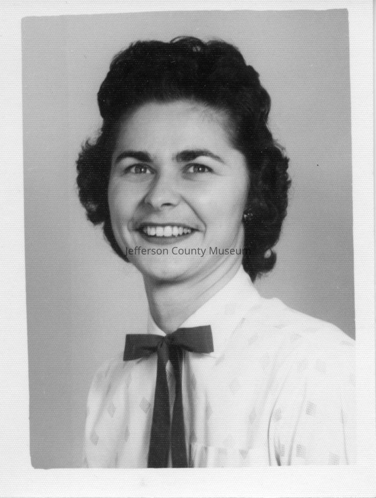Undated photo of M.L.M.S. with short hair and wearing white blouse with horse bar pin at throat
