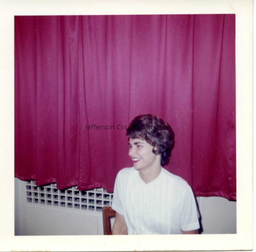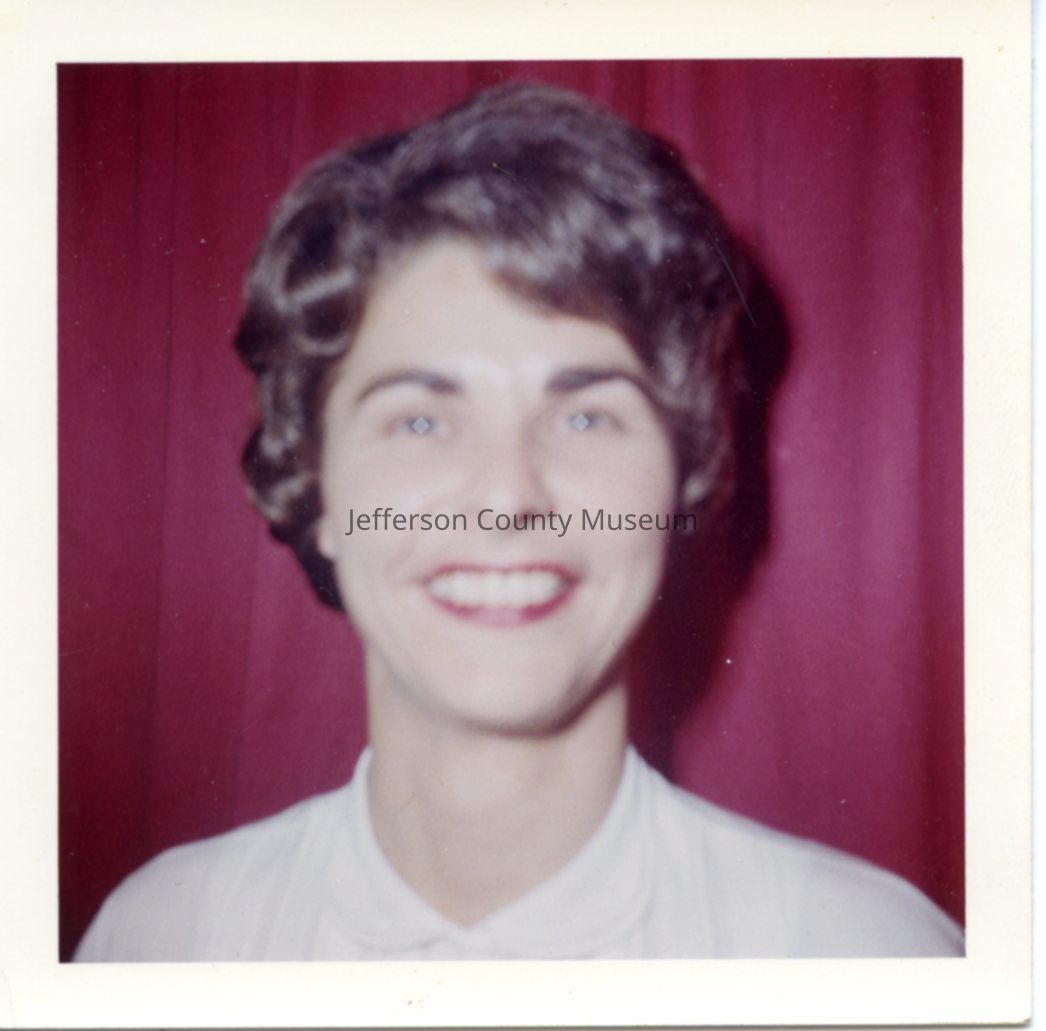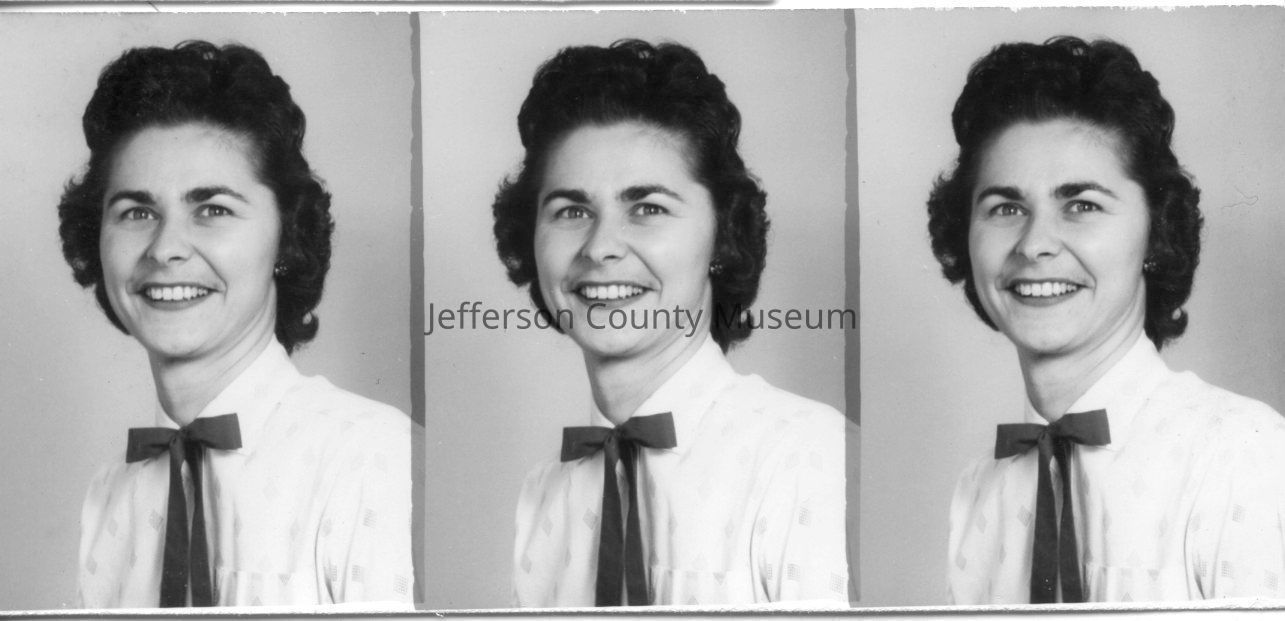 Strip of 3 photos and 1 larger photo of M.L.M.S., same view, wearing white blouse with black tie at throat, "1960" penciled on larger photo