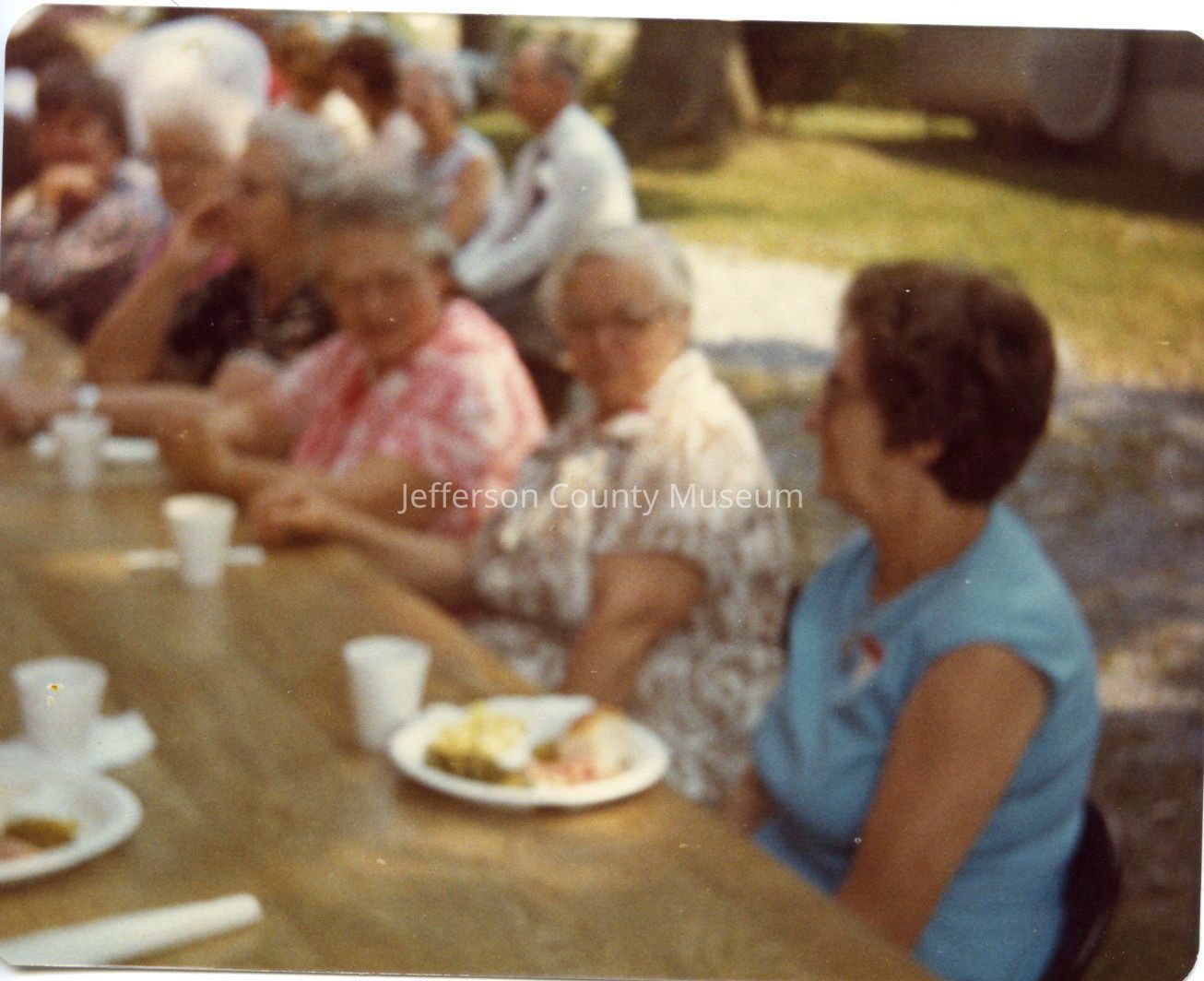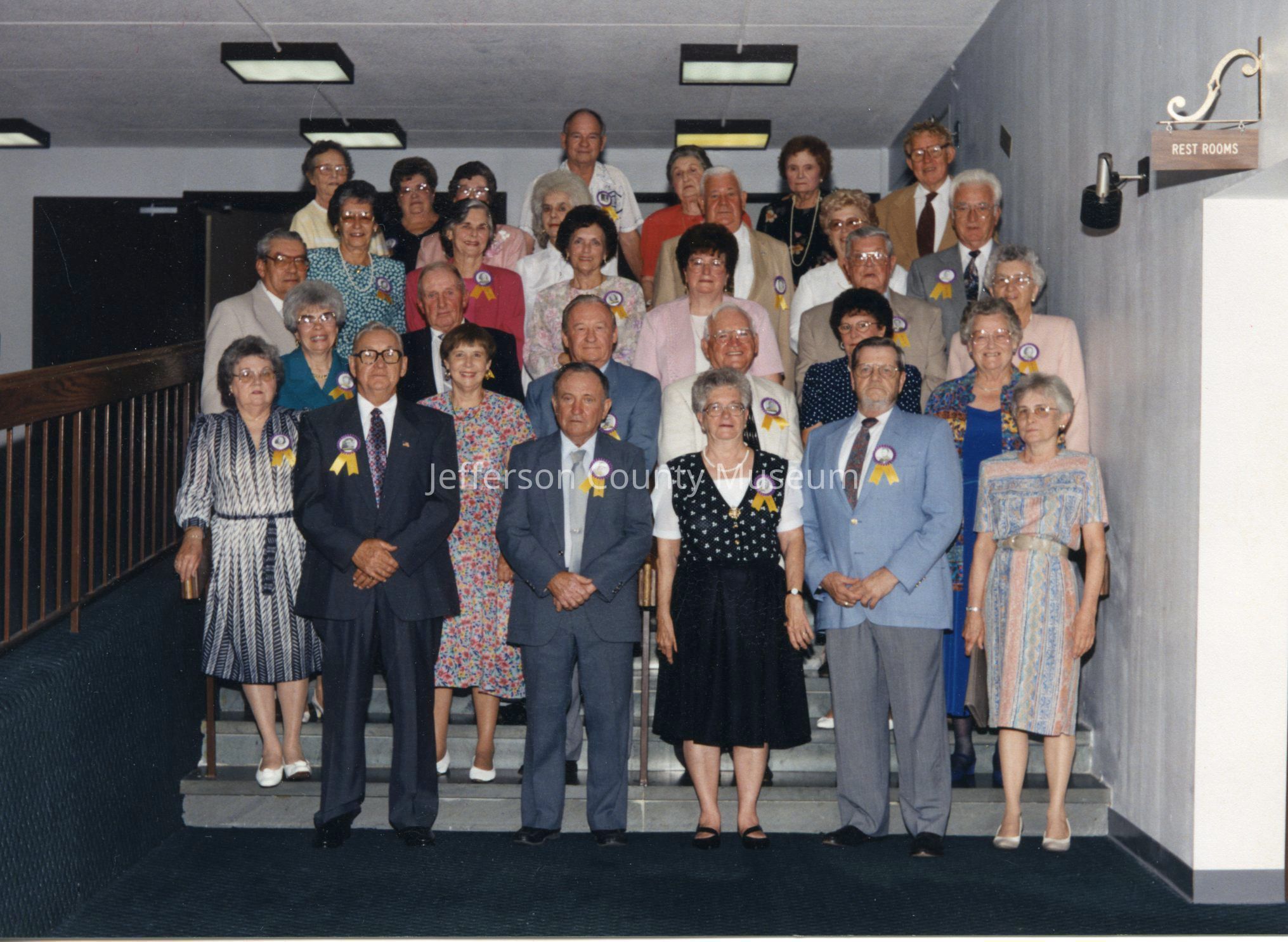 Color photo of 50th class reunion of CHS class of 1946, showing class members wearing the below-described rosette pin