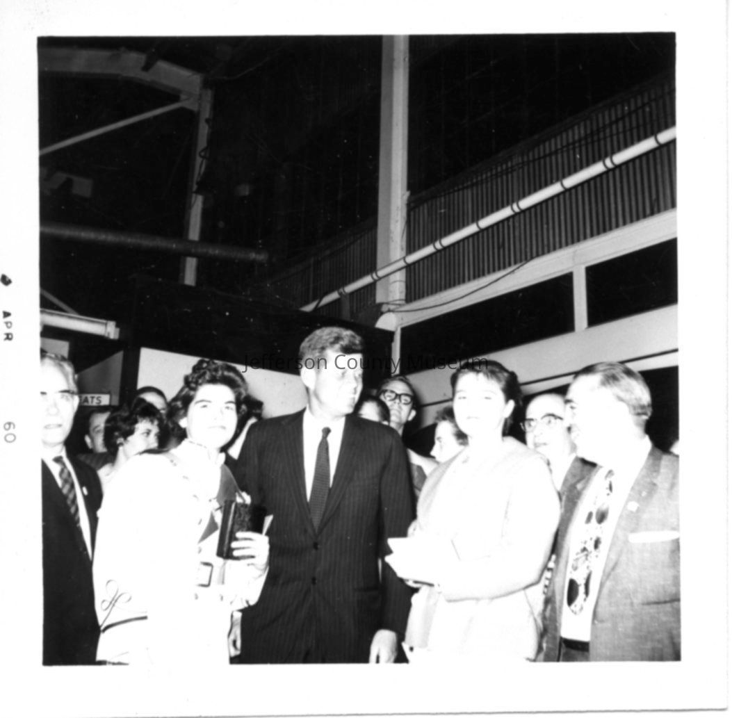1960 photograph of John F. Kennedy campaigning at Charles Town Racetrack. Also in photo is Nick Carson, unidentified woman in Charles Town High School band uniform, woman who may be Janet Clendening, and unidentified man.