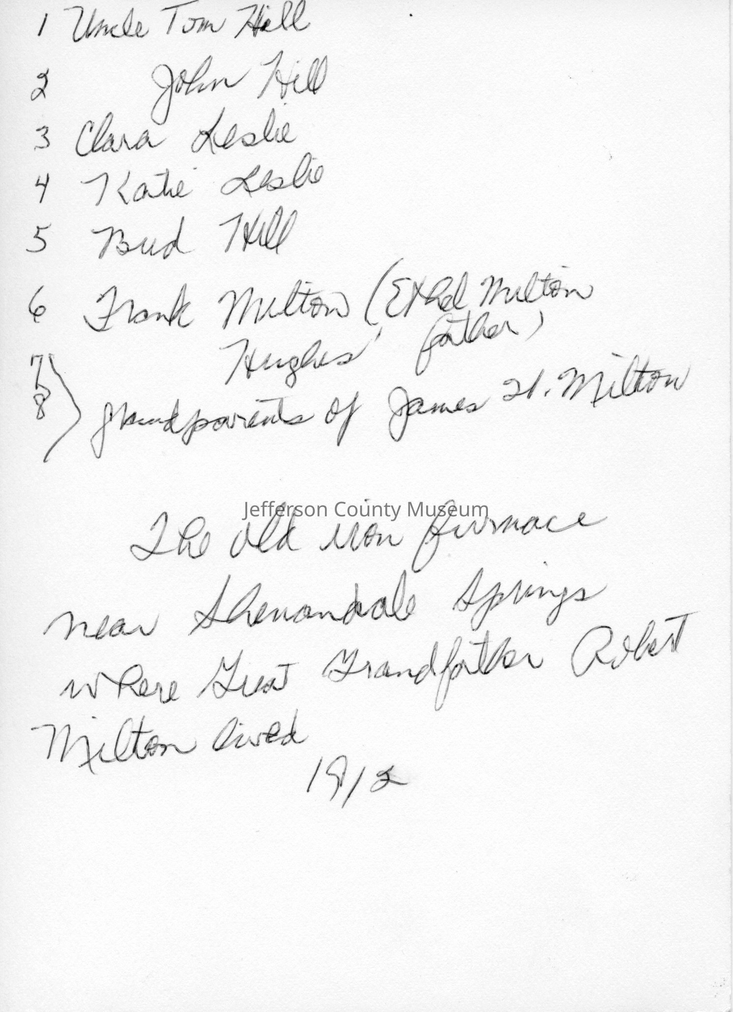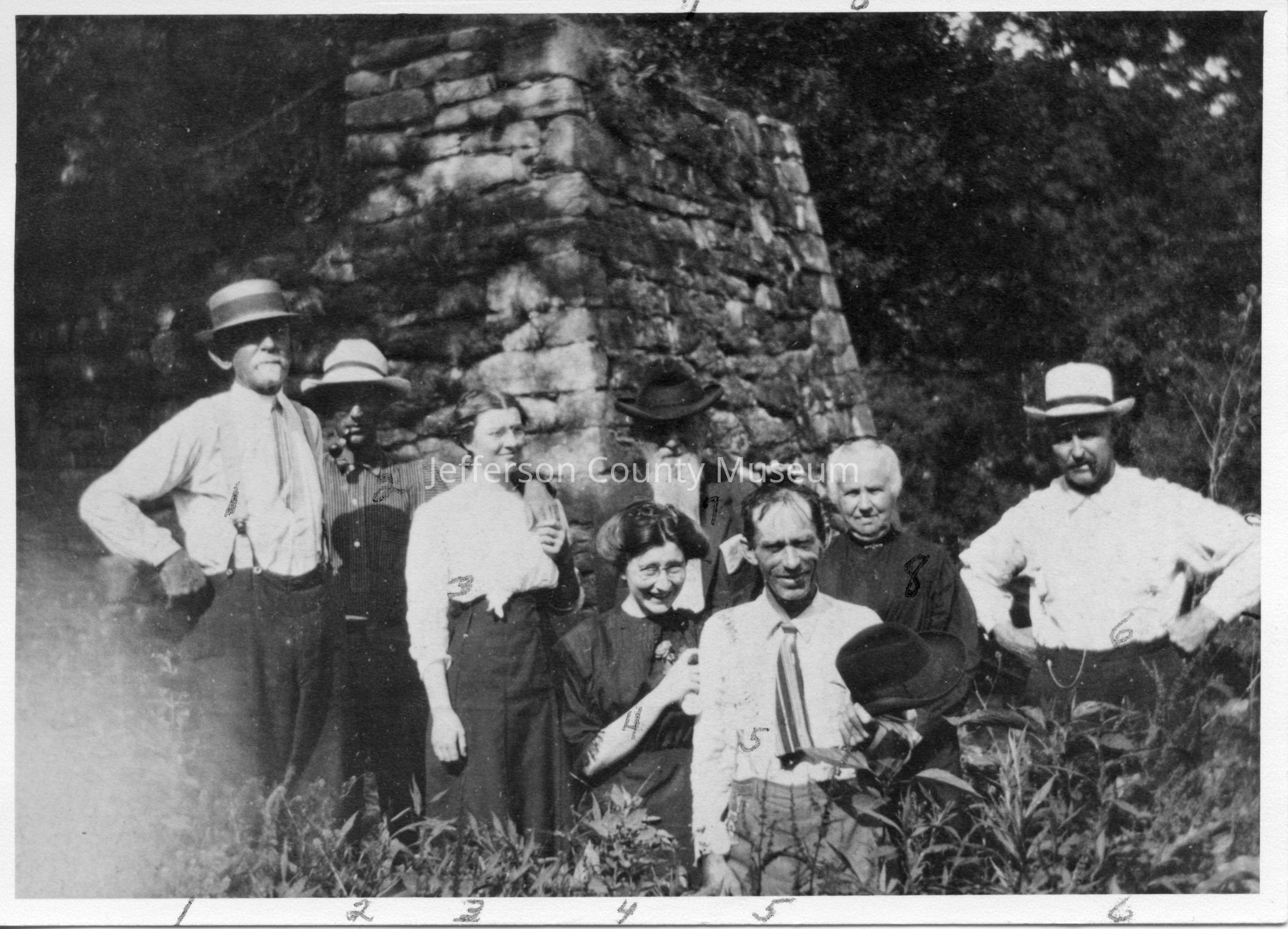 black & white photo of eight people in front of the Shannondale Iron Furnace. From left: Tom Hill, John Hill, Clara Leslie, Katie Leslie, Robert Milton (#7, with beard, grandfather of James William Milton), Bud Hill, Harriet Cross Milton (#8, wife of Robert Milton), and Frank Milton (father of Ethel Milton Hughes). 1912. Handwriting on back of photo is that of Mary Milton Simmons.Acquisition