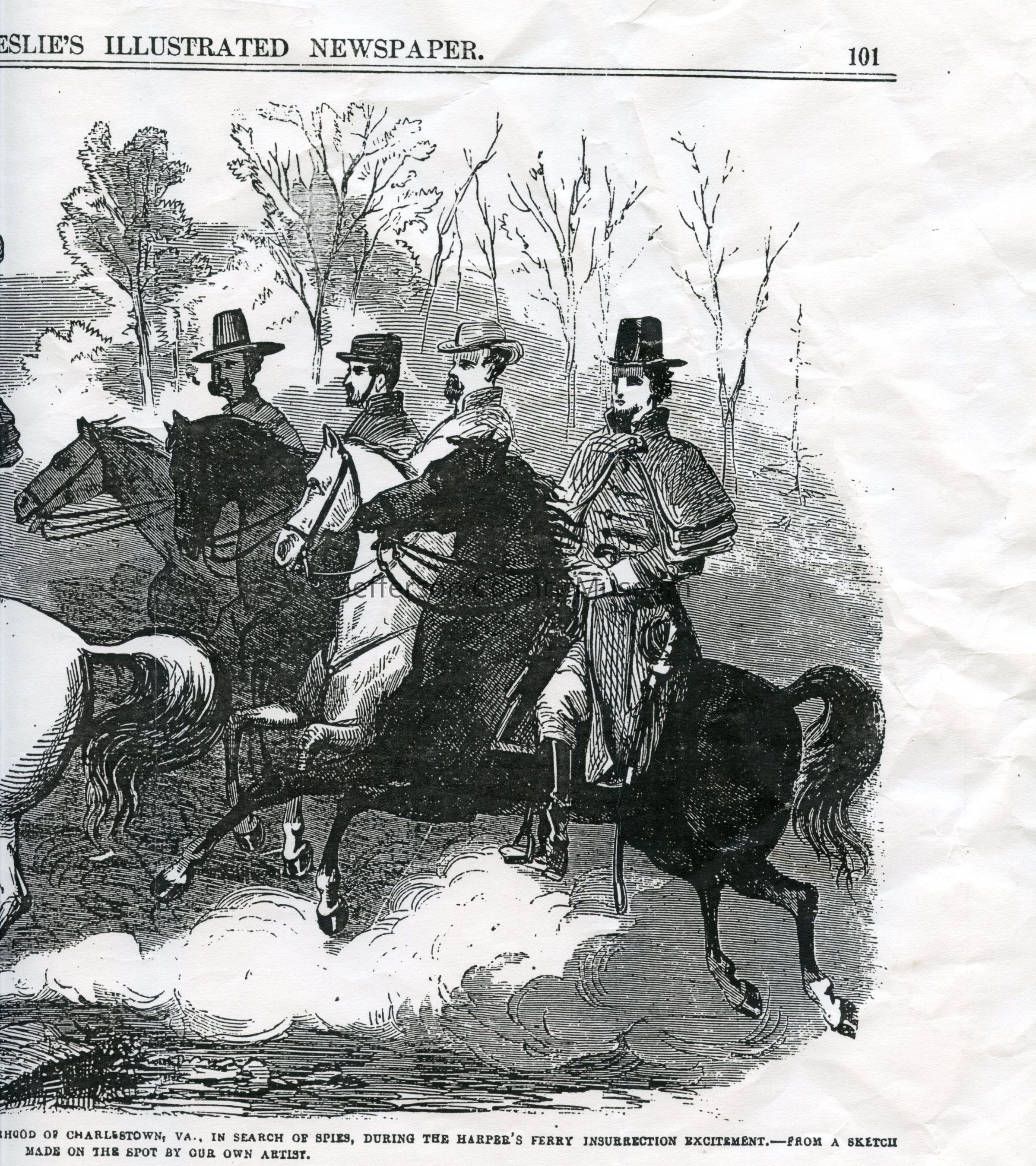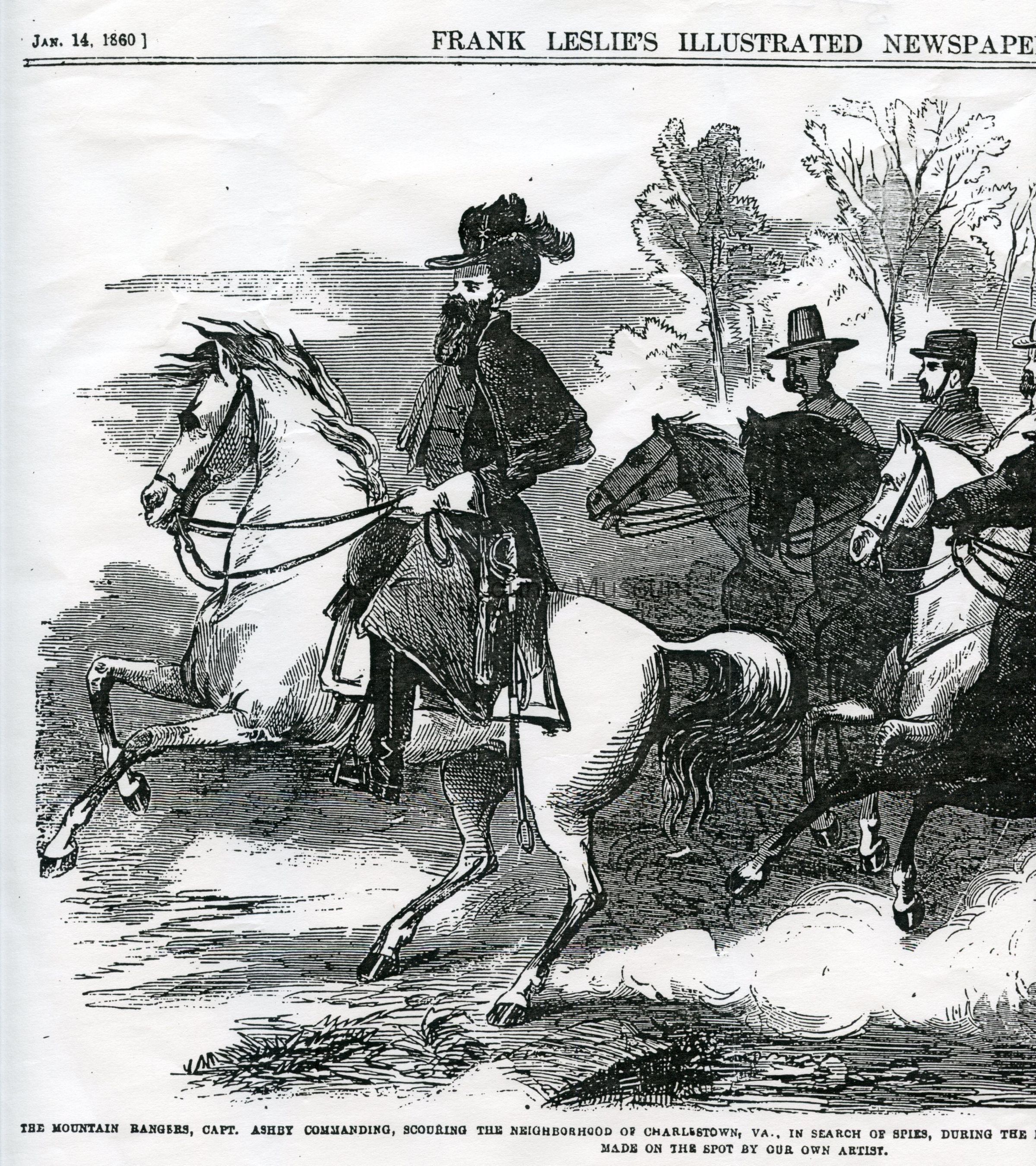 Caption reads: The Mountain Rangers, Capt. Ashby commanding, scouring the neighborhood of Charlestown, Va., in search of spies, during the Harper's Ferry insurrection excitement. -- from a sketch made on the spot by our own artist."Acquisition