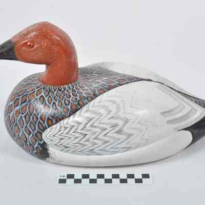 Life size painted wood carving of canvasback duck, carved as if floating on water with wings folded over back. Carving has black bill, red head, white wing and body and red, black and white feathers on breast.Acquisition