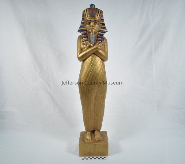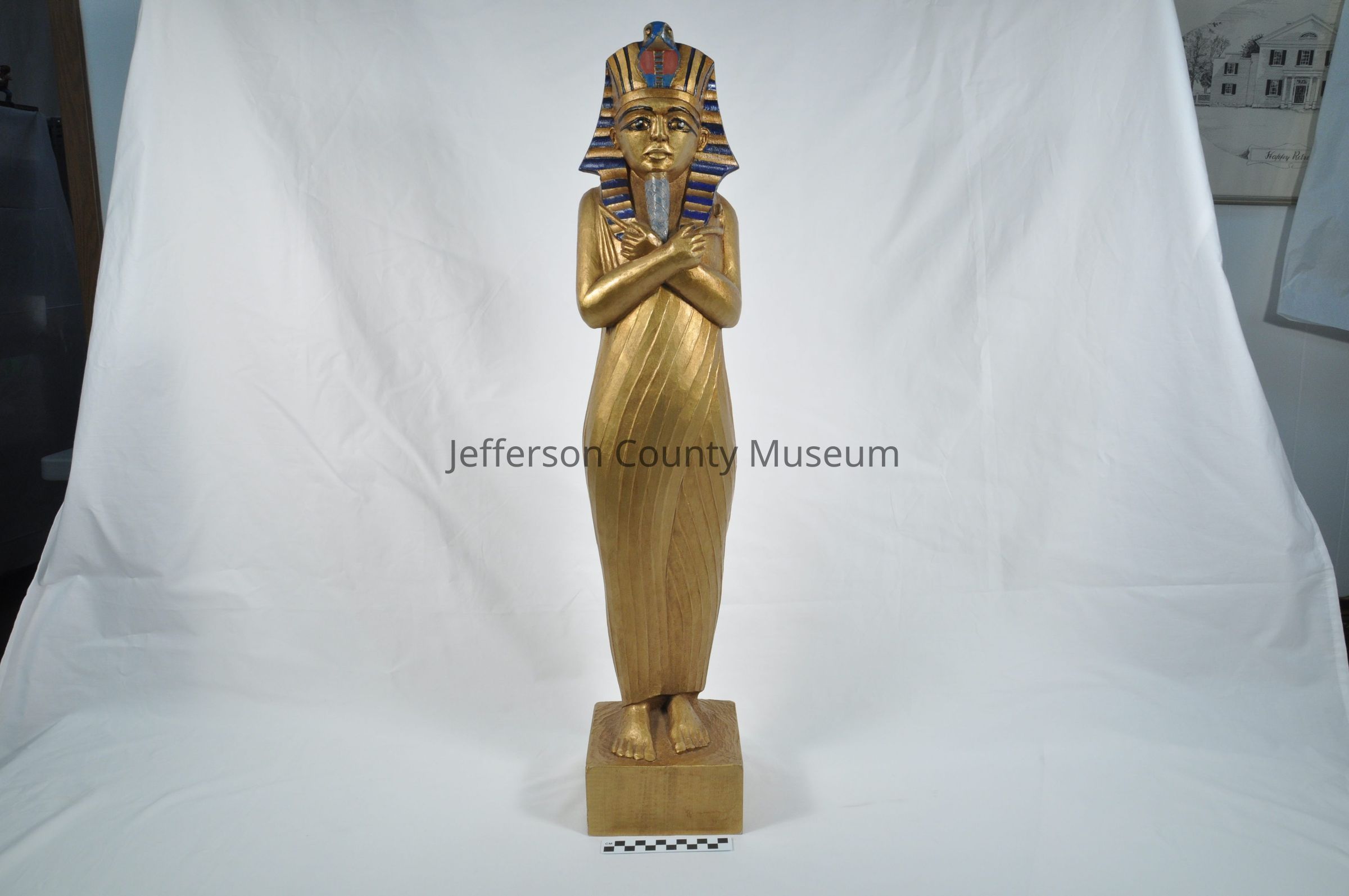 Painted wood carving of King Tutankhamun in intricate detail including blue and gold crown with snake on top and stylized beard. Figure has arms crossed on chest holding what appears to be a staff in one hand and crooked staff in other. Figure is dressed in form fitting robe to ankles and has bare feet. Gold paint over entire figure except crown and head. Base has "JHS" carved into it.Acquisition