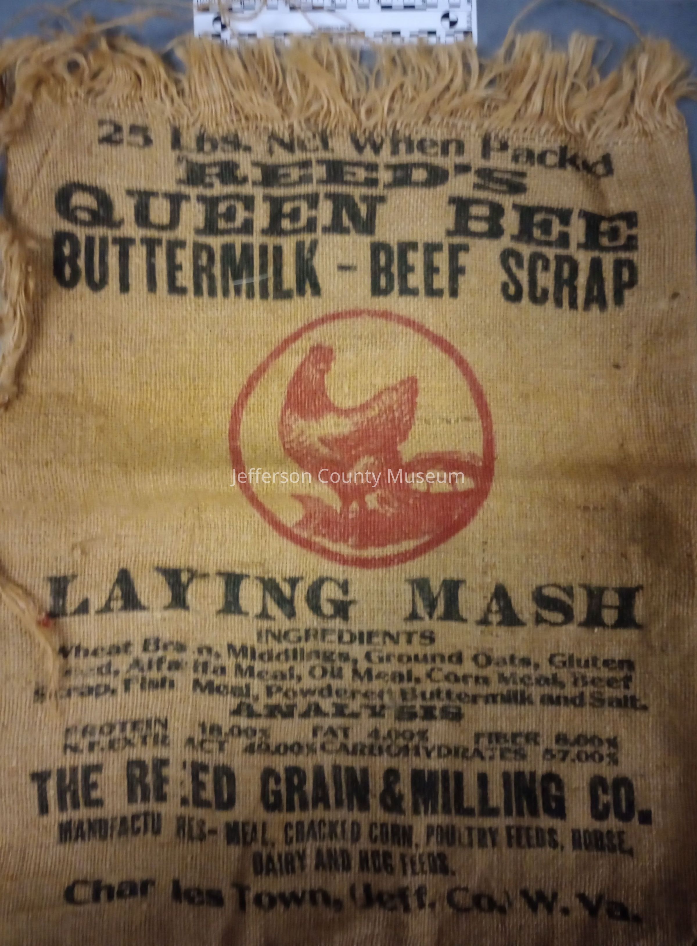 Burlap sack from the Reed Grain and Milling Co in Charles Town. "Reed's Queen Bee Buttermilk-Beef Scrap" at top with a red graphic of a Chicken that says "Laying Mash" underneath. Ingredients and nutrition facts are printed on the front. Almost identical to 2025.006.013.Acquisition