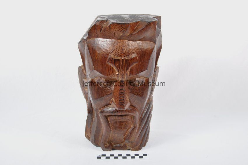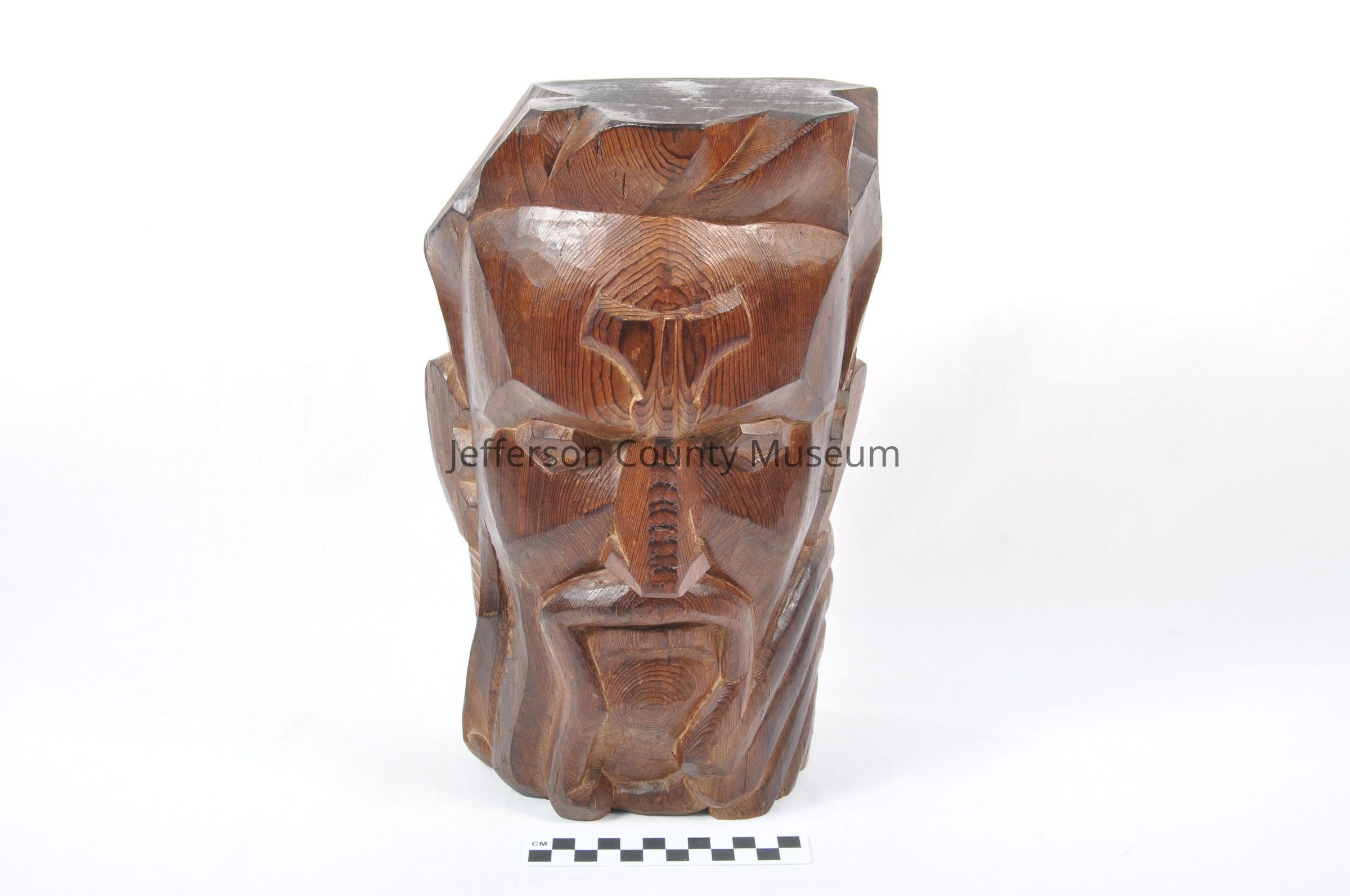Bust, possibly of John Brown, with long moustache and vertical wrinkles in brow. Dark wood. "JHS" carved on back.