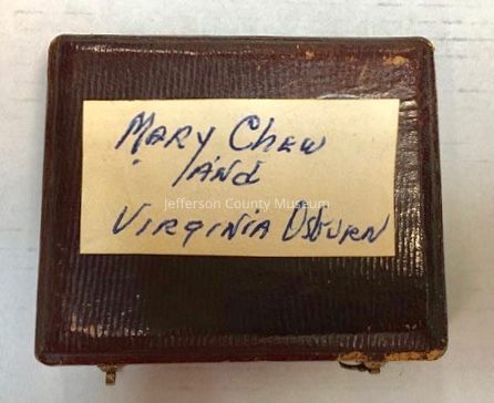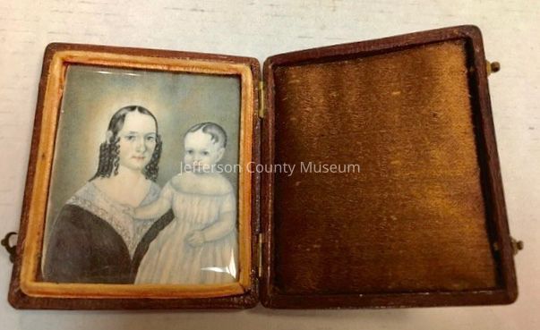 Watercolor on ivory of woman and child in a 2 1/2" x 2" brown leatherette, hinged case with two hook-and-post closures. Outside of case, on one side is a piece of tape (or paper glued to case) with words handwritten in blue ink: "Mary Chew and Virginia Osburn".