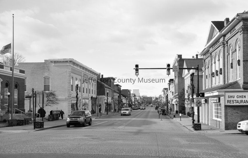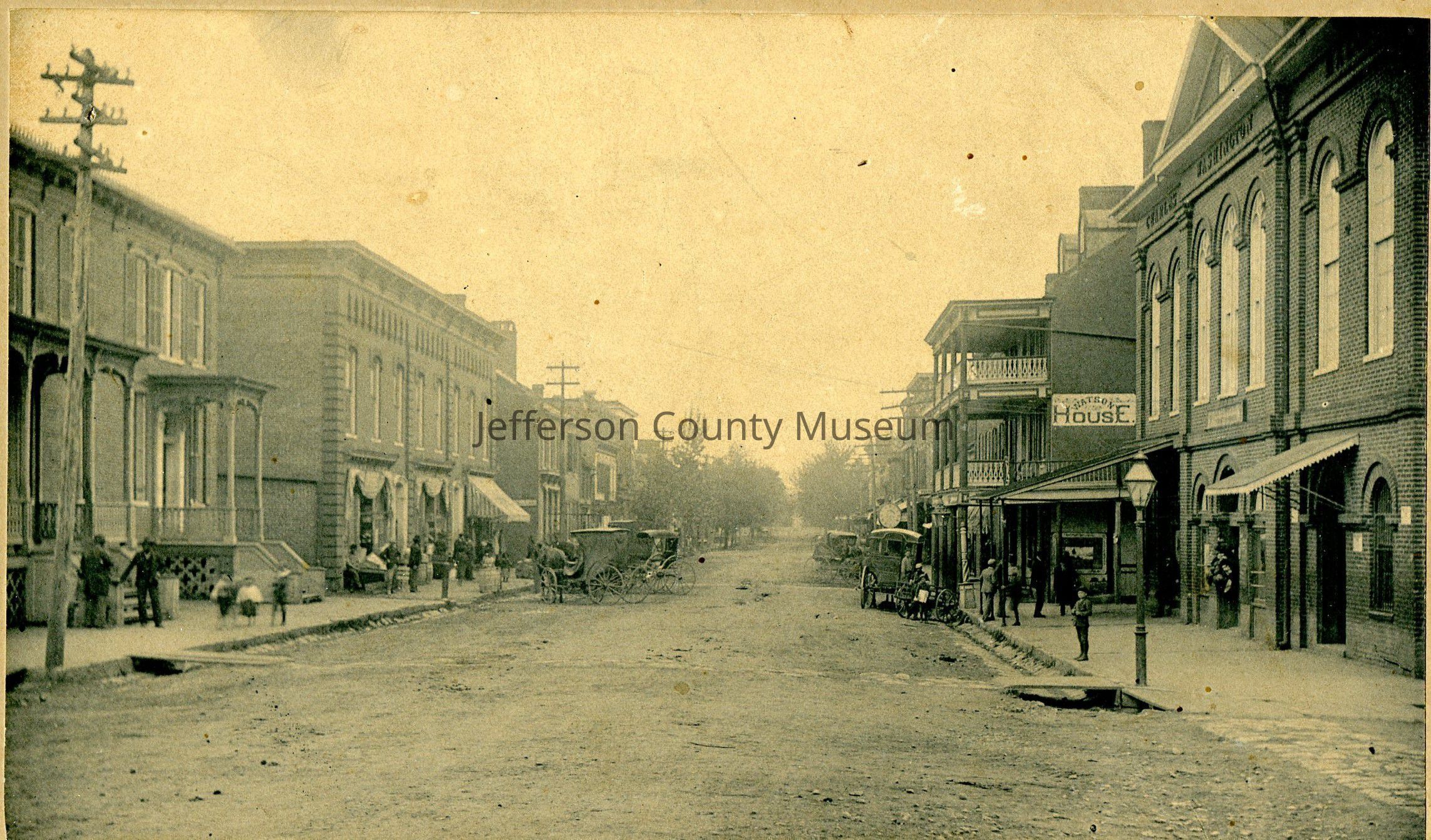 Upper photo: Looking west on Washington Street from George Street before 1919. The original Jefferson County Jail was destroyed during the Civil War and rebuilt in 1874. The rebuilt jail is visible on the far left of the photograph. (IMG1)