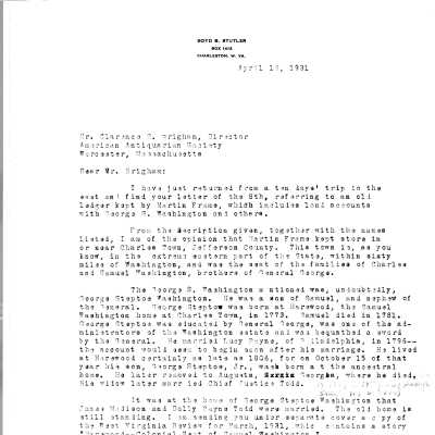 (Attached in Media are index to customer names, list of goods sold and credited, annotated catalog record from American Antiquarian Society (AAS), 1931 letters from Boyd Stutler to AAS about M. Frame ledger.)