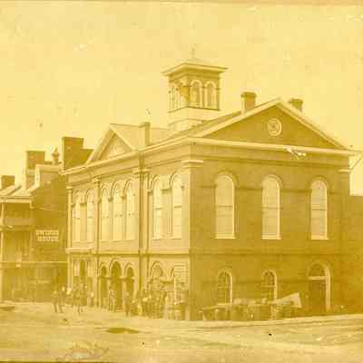 Lower photo left: Site of Charles Washington Hall on the northwest corner of George and Washington Streets. The original market house was destroyed during the Civil War. Pictured here are temporary commercial buildings which occupied the site until Charles Washington Hall was built in situ in 1874. (IMG354)