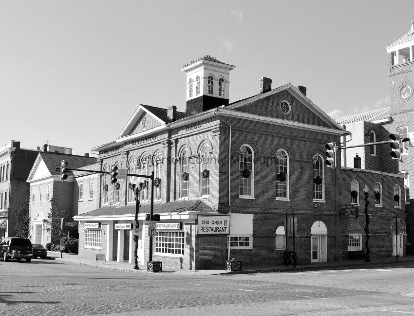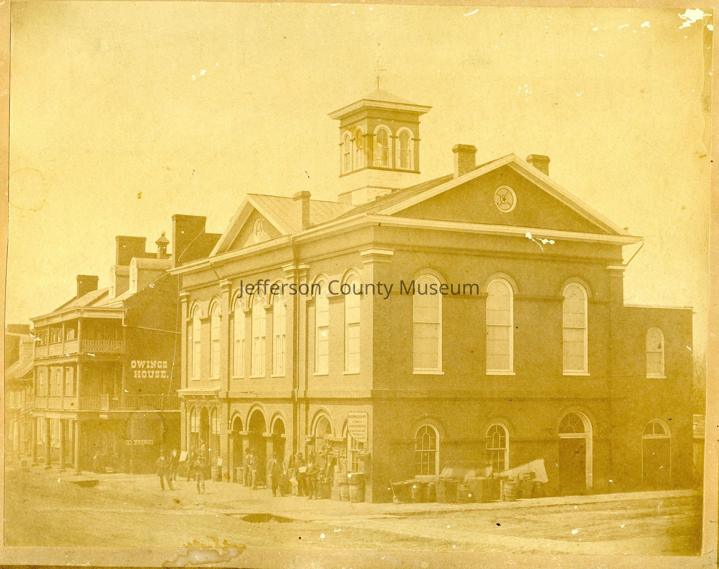 Upper photo: The original Market House was dedicated in 1786 by Charles Washington, brother of George Washington and founder of Charles Town, and was destroyed during the Civil War. Charles Washington Hall was rebuilt on the same site in 1874. Over the years a number of commercial enterprises occupied the first floor including the U. S. Post Office. The second floor was built as an auditorium and functioned as such until the Opera House was built on North George Street in 1910 and the second floor was converted into office spaces. (IMG12)