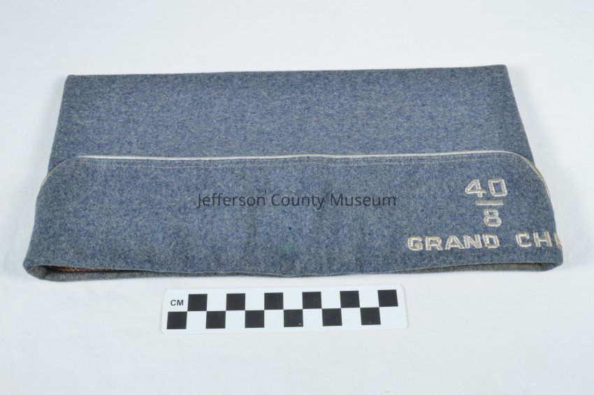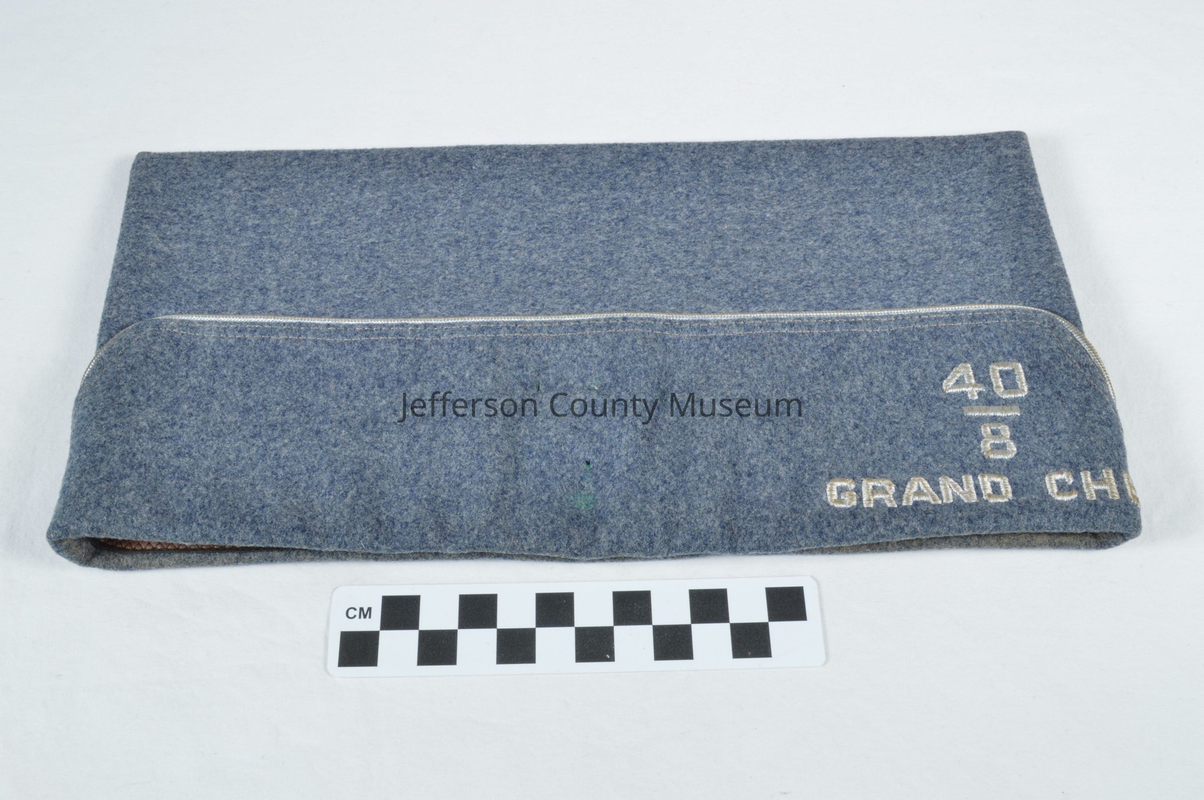 Cap with medals on each side (see # 149 and # 177). Light blue wool with satin lining. "T T. PERRY" in ink on sweat band, size 7 1/8. Left side has "W.VA. MINOT 1959". Right side has '40 over 8 GRANDE CHE". [See # 149: Medal on left side with light blue ribbon. Bar at top has "AMERICAN LEGION" star logo over "40/8". Bar has "LA SOCIETE DES 40 HOMMES ET 8 CHEVAUX". Square medal below ribbon shows horse and man in train car with soldier standing beside train car.] [See # 177: Medal on right side in shape of shield has star at top and says "GRANDE VOITURE WEST VIRGINIA". Also has Great Seal of State of WV and American Legion logo over 40 over 8. Railroad car at bottom.]Acquisition