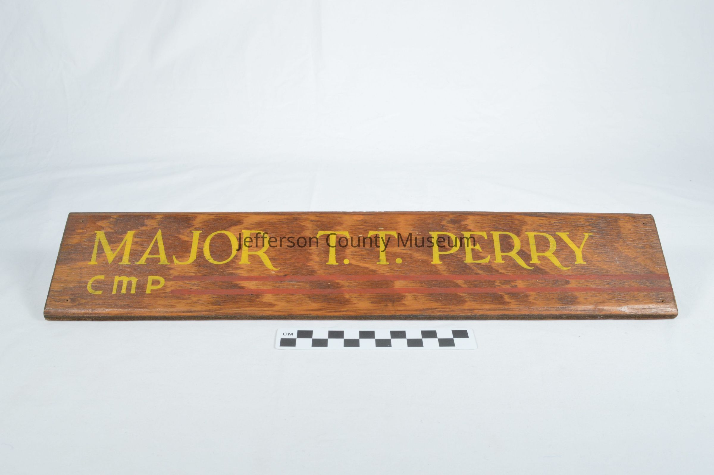 Varnished wood door nameplate. "MAJOR T. T. PERRY CMP".