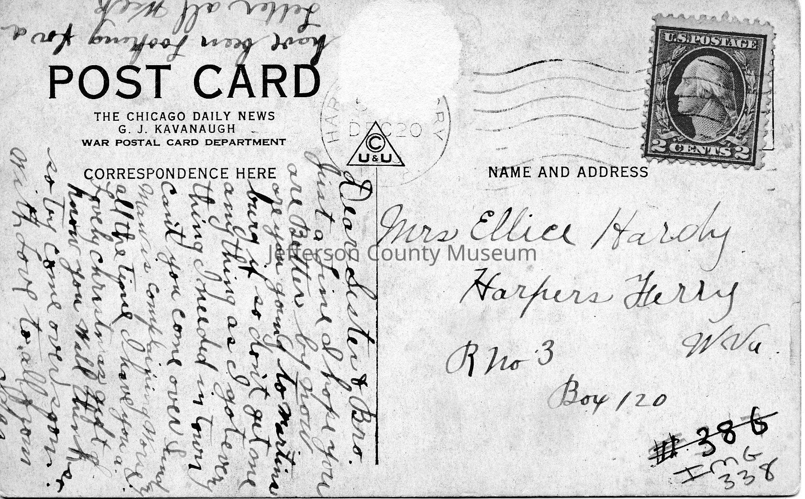 Postcard addressed to: Mrs. Ellice Hardy, Harpers Ferry, W. Va., R No 3, Box 120.