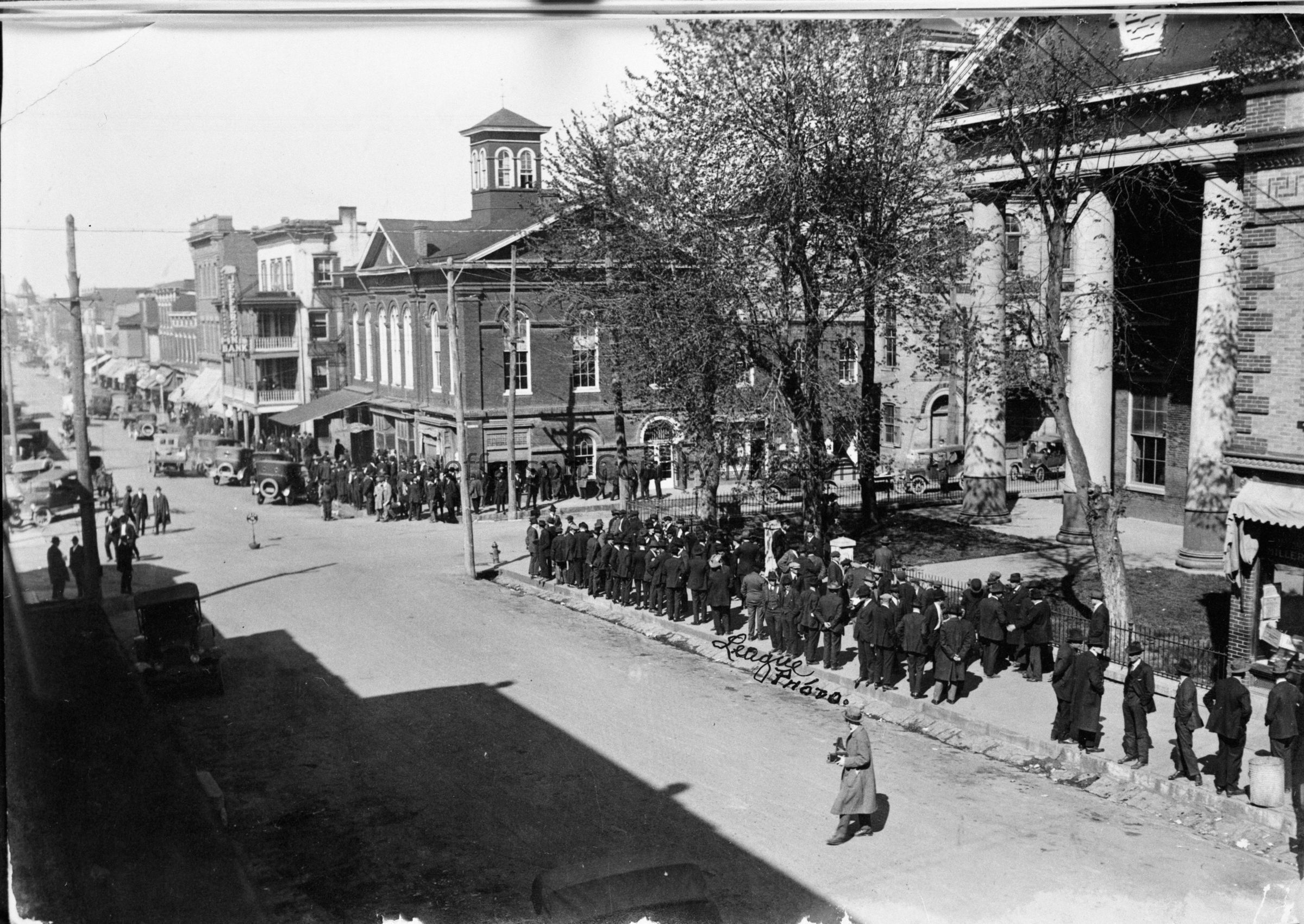 Upper photo: Miners' trial, group outside Jefferson County Court House, circa 1922. (IMG1390)