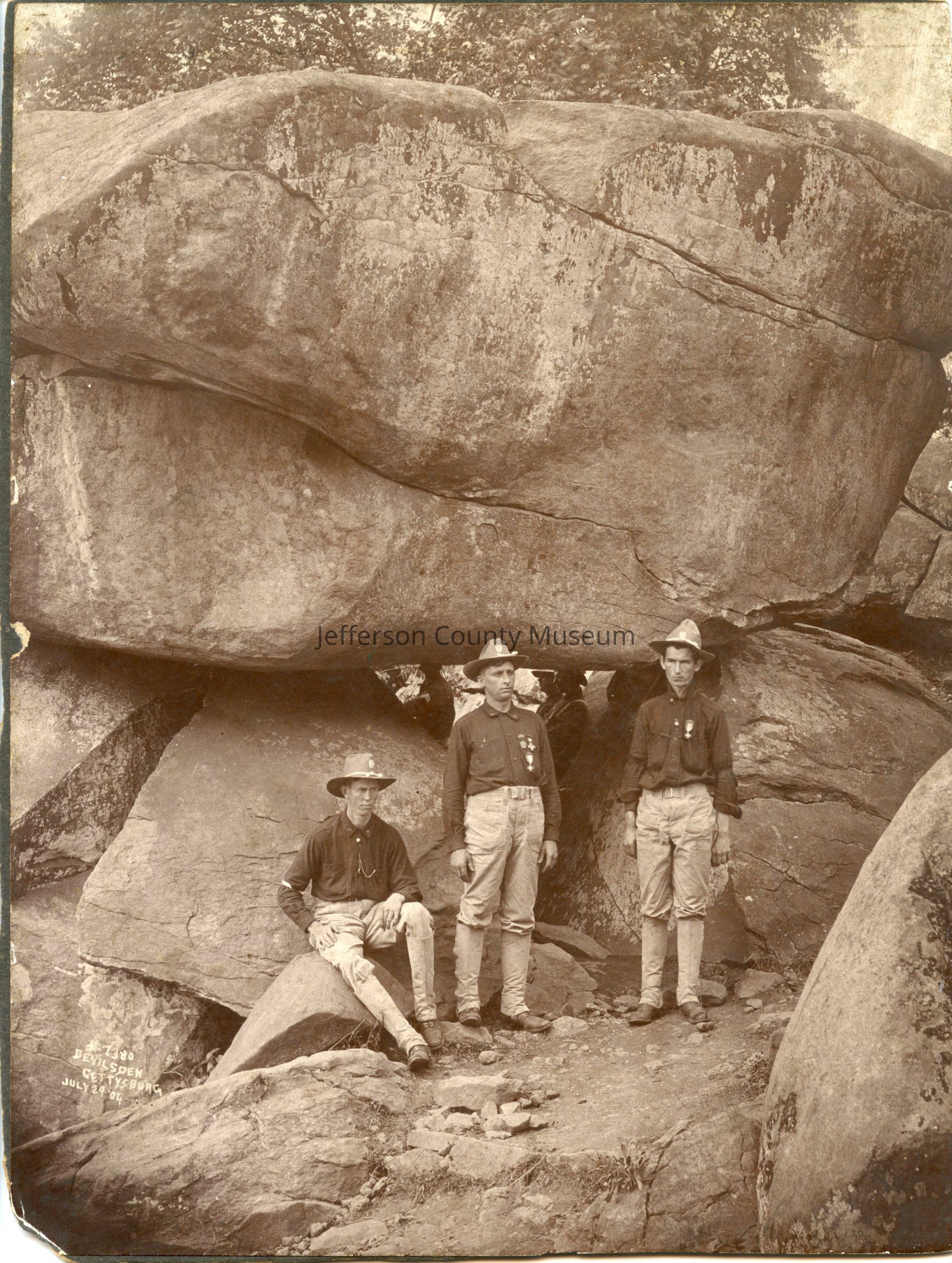 Three soldiers posing in front of rocks. They may be wearing Spanish American War uniforms (?)