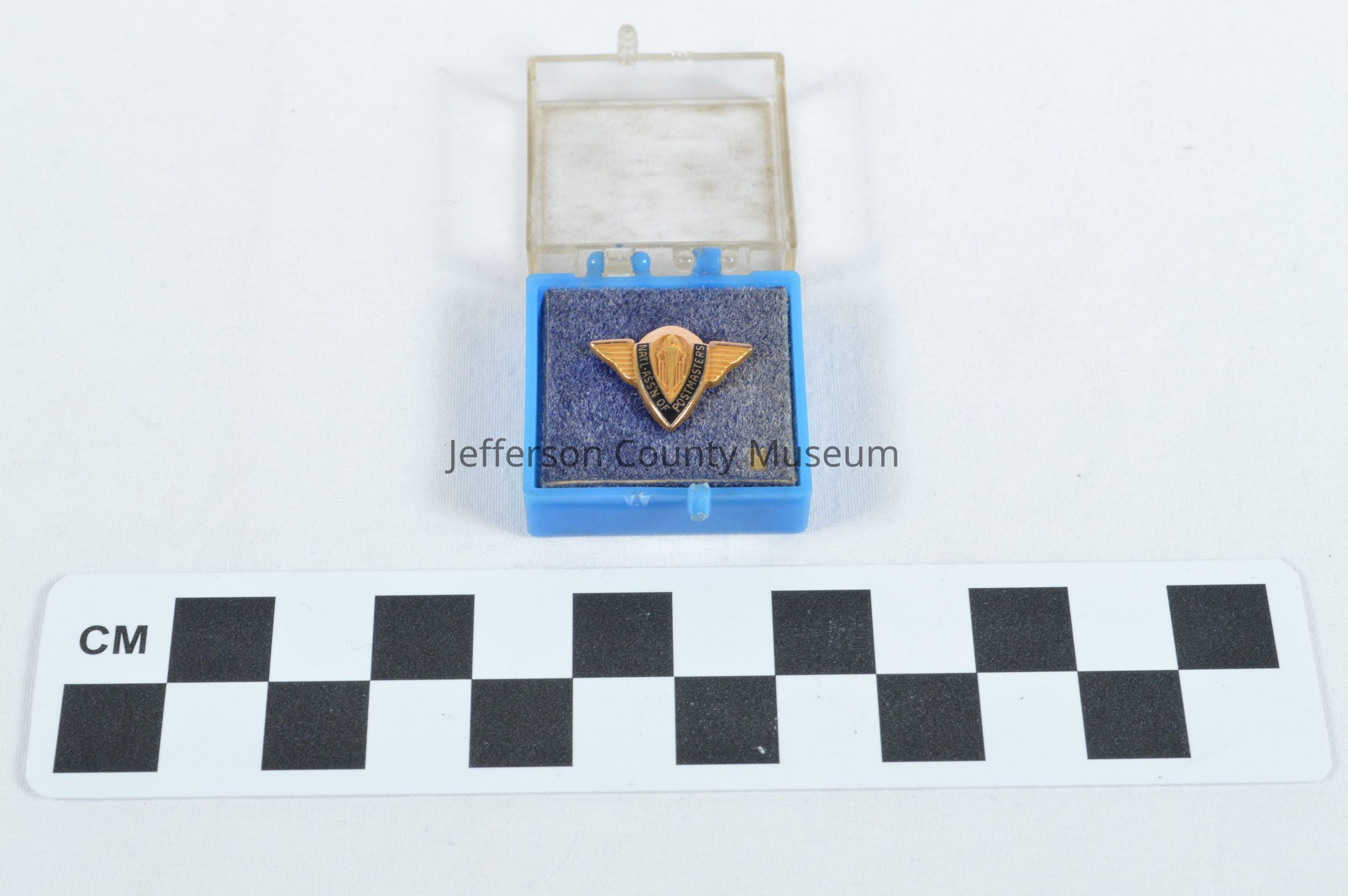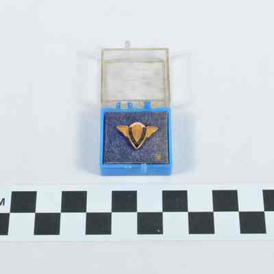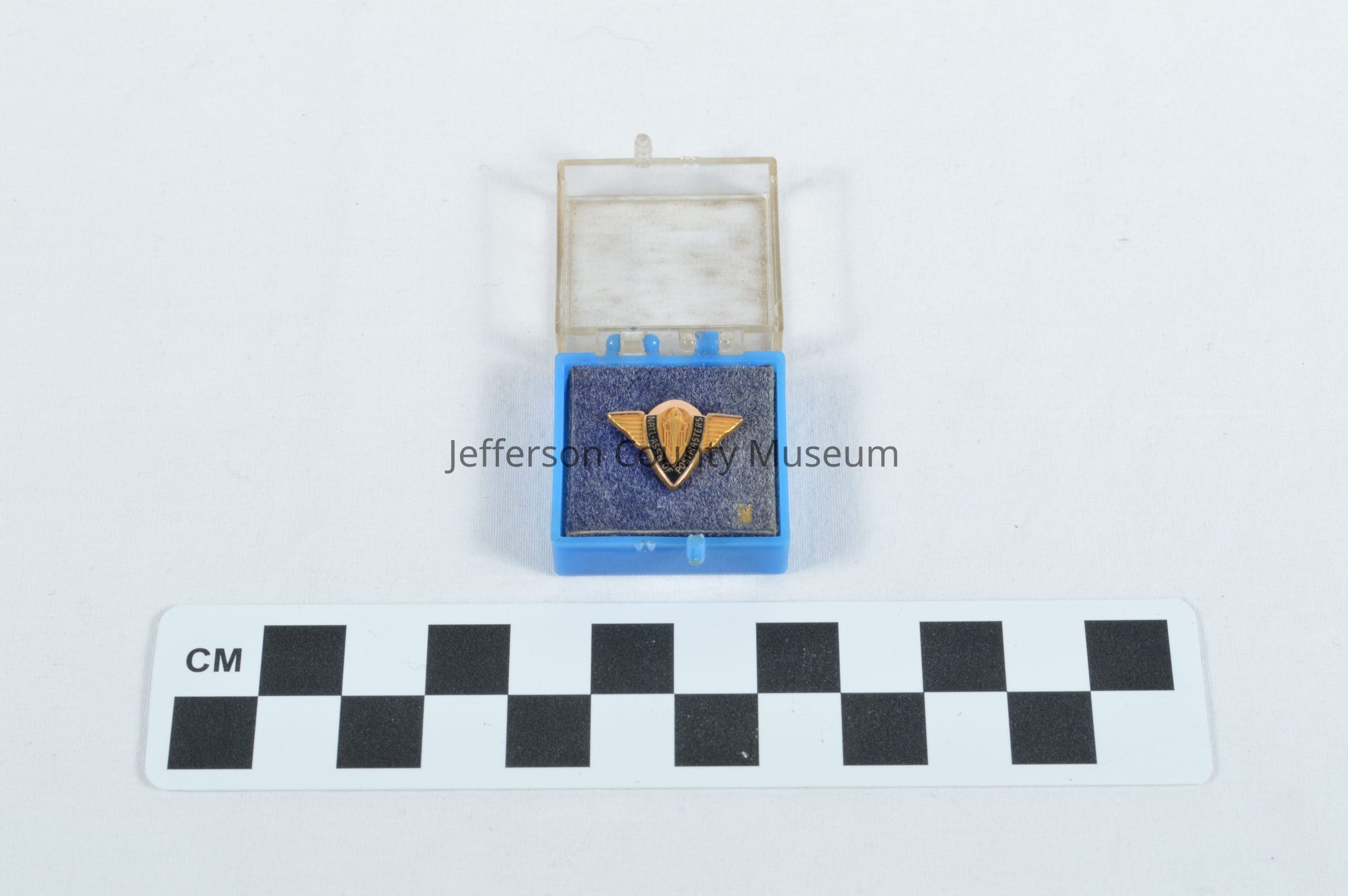 Black and gold pin, in plastic box with clear top and blue bottom roughly triangular shaped with wings on sides. In the center is a torch in front of a shield. Inlaid in the back is "NATL. ASS'N OF POSTMASTERS".Acquisition