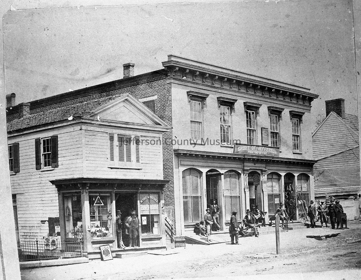 Upper photo: Spirit of Jefferson printing office, 110 East Washington Street, on the north side of East Washington Street between George and Samuel Streets, and Aisquith & Company Pharmacists at 108 East Washington Street. (IMG1642)